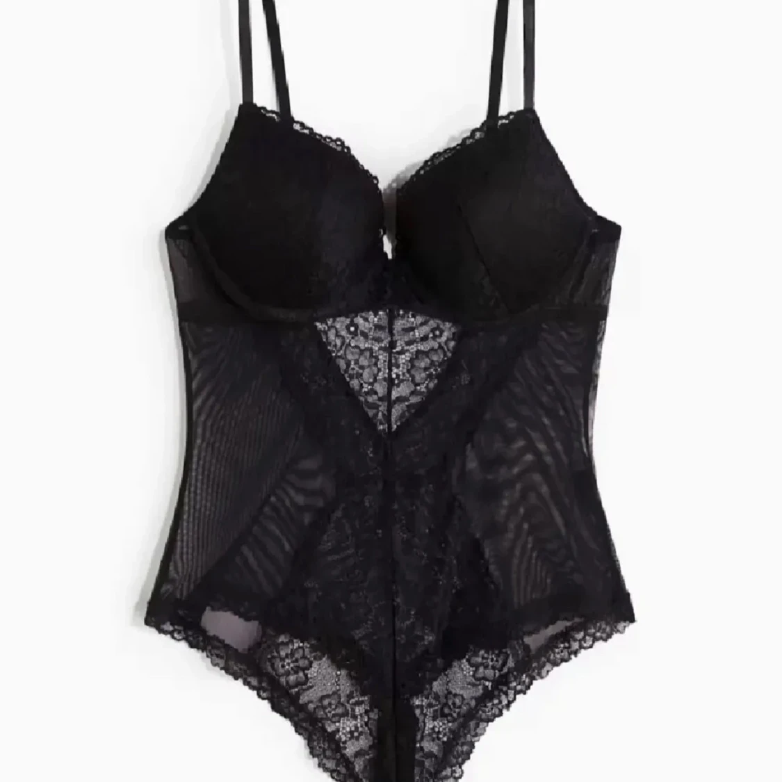 Säljer en svart body med tunna axelband och vacker spetsdetalj framtill. Bodyn har genomskinliga meshpartier på sidorna och en djup urringning. Tryck på KÖP NU så postar jag så snabbt som möjligt!! 🩷🩷