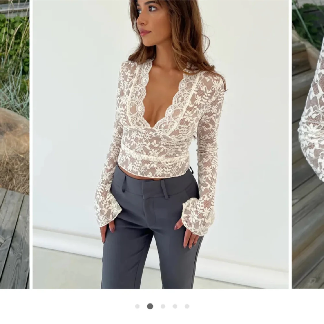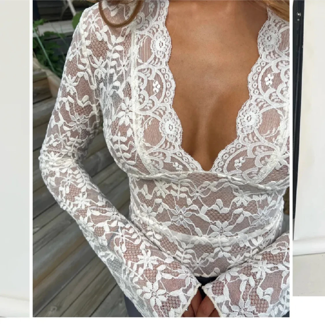Elegant vit spetsblus med v-ringning och långa ärmar. Blusen har ett vackert blommigt mönster och är perfekt för en stilfull look. Aldrig använd, i storlek s/m💕