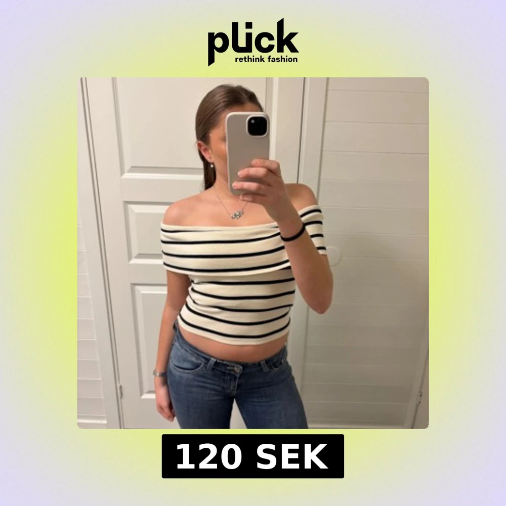 Säljer en stilren offshoulder topp med svarta ränder på vit bakgrund. Toppen är super fin och knappt använd
