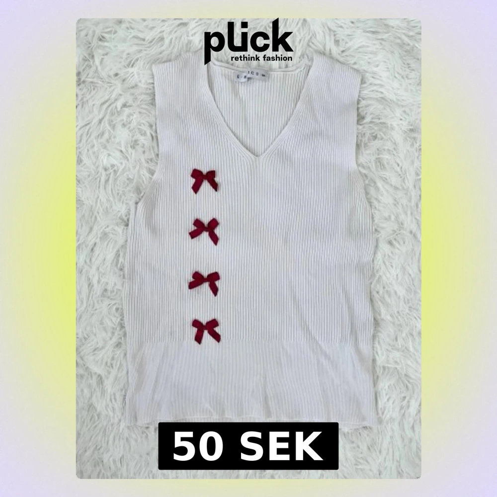 Supersöt ärmlös topp i ribbad vit bomull med v-ringning och fyra röda rosetter på framsidan. Har små fläckar på rosetterna (se bild 3). Storlek: S, passar 34-36.