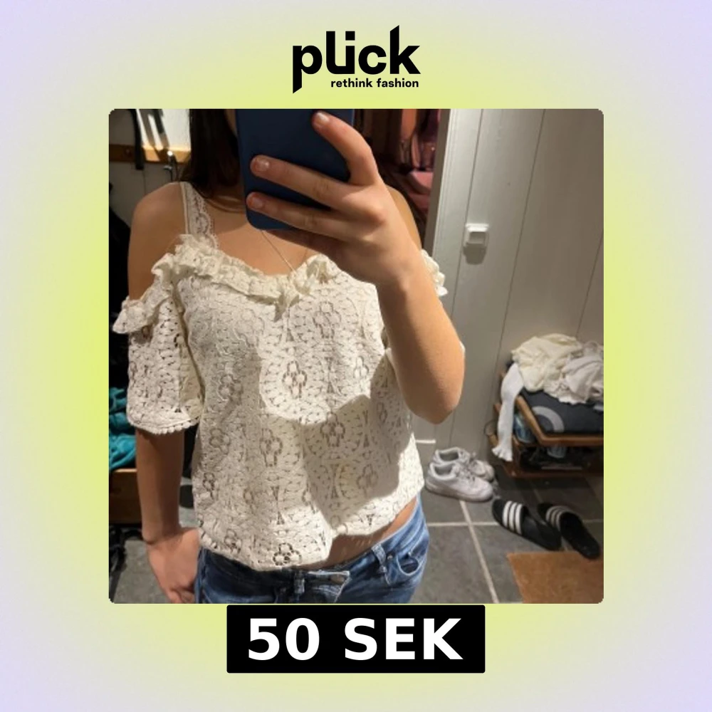 Säljer en söt vit spetsblus med offshoulder-design och volangdetaljer. Blusen har korta ärmar och ett vackert spetsmönster som ger en romantisk känsla. Perfekt för sommarens varma dagar. Tycker den är jättefin men kommer inte till användning längre. Den har lite skavanker som ni ser men inget som stör när han har på sig den!!💓💓