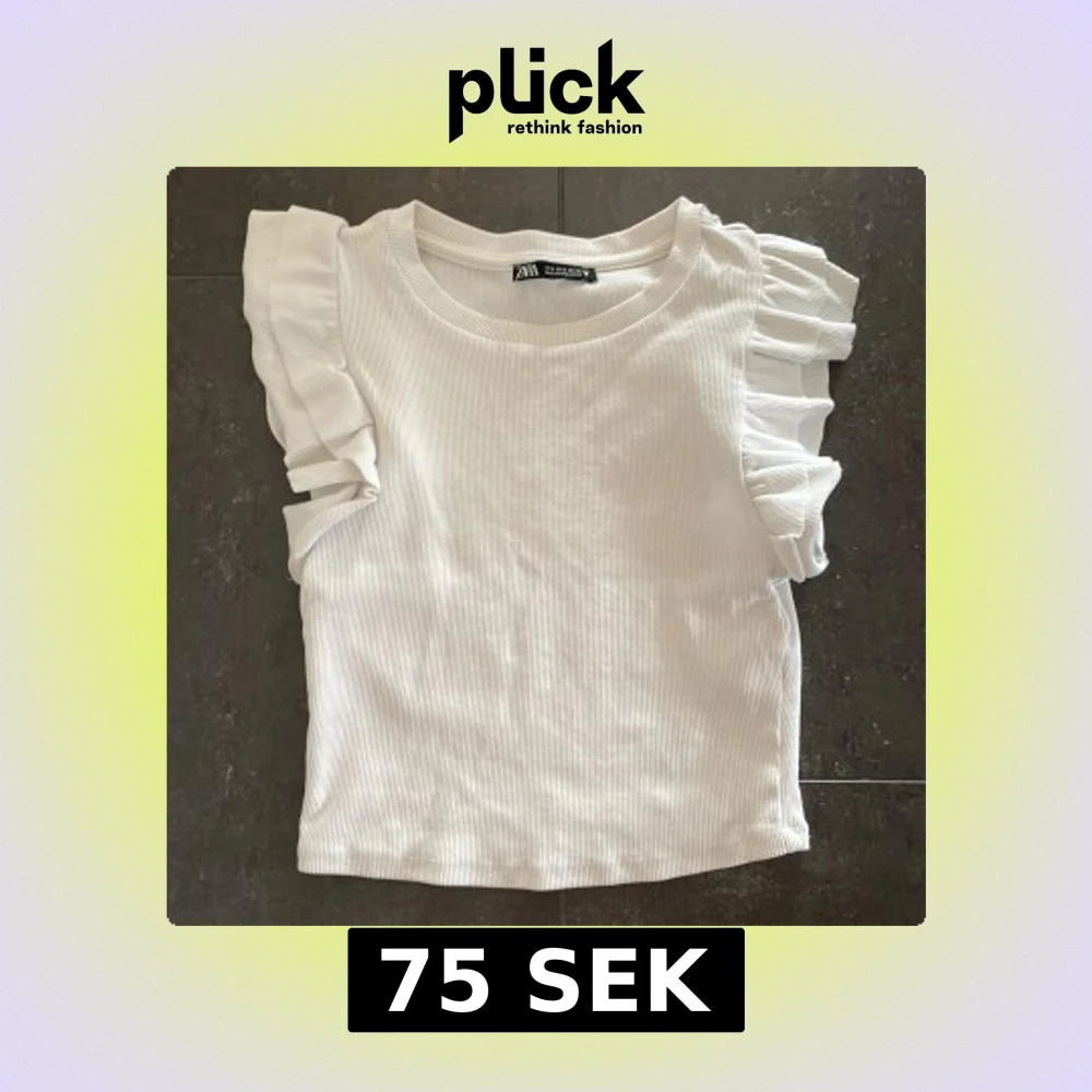 Superfin vit ribbad topp från Zara med volangdetaljer på axlarna. Toppen är ärmlös och har en rund halsringning. Perfekt för dig som gillar en söt och trendig stil med extra detaljer på axlarna.
