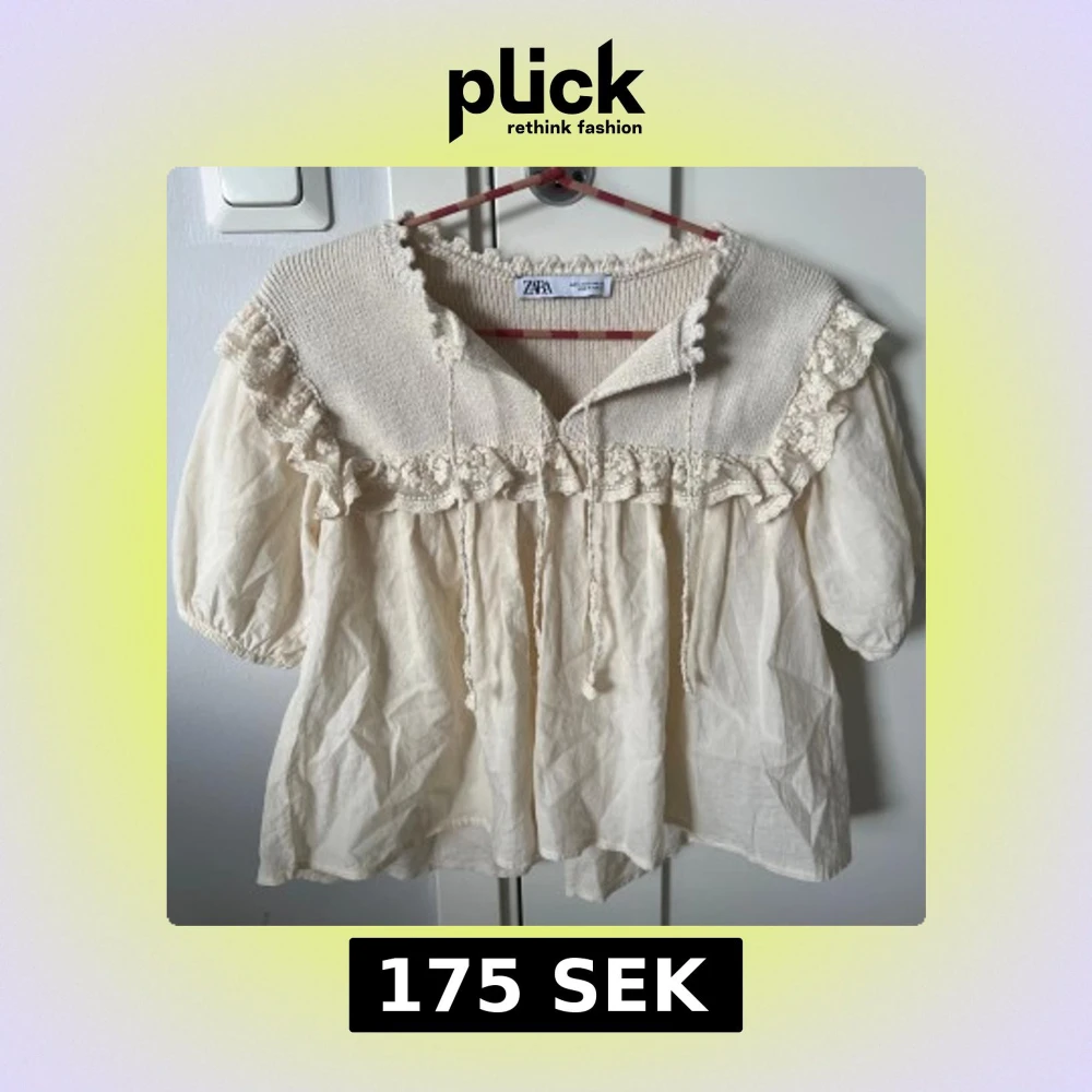 Supersöt krämvit blus från Zara med stickad överdel, volangkant och broderade spetsdetaljer som inte säljs längre.💕💕 Endast använd 1-2 gånger och säljer just pga det. Nyskick, priset kan diskuteras. Köparen står för frakten.