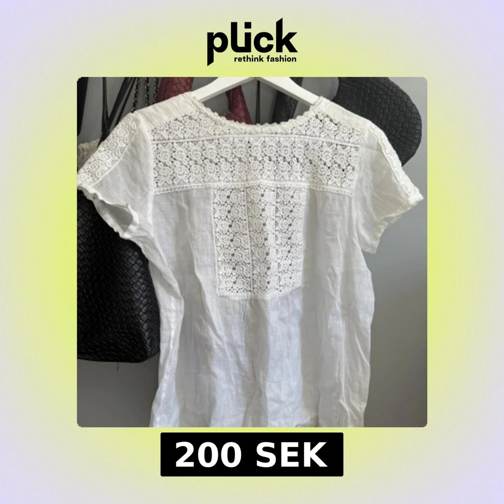 Säljer en söt vit blus med vackra spetsdetaljer upptill och framtill. Blusen har korta ärmar och är tillverkad i ett lätt och luftigt material, perfekt för varmare dagar. Spetsen ger en romantisk känsla och gör blusen extra fin.