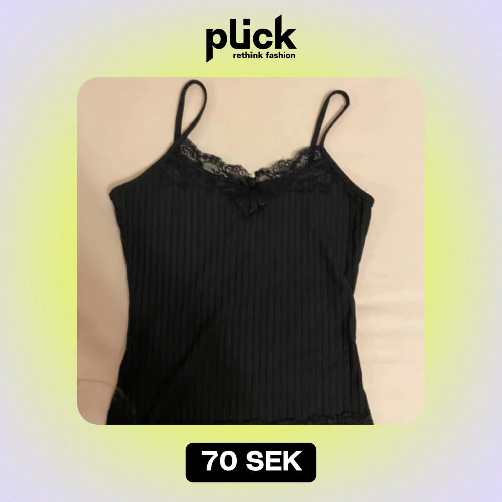 Ett fint svart linne med smala axelband och spetsdetaljer vid halsringningen och nederkanten. Linnet har en ribbad struktur och är tillverkat i ett mjukt och bekvämt material. Aldrig använt. Skriv gärna om ni har frågor 💕