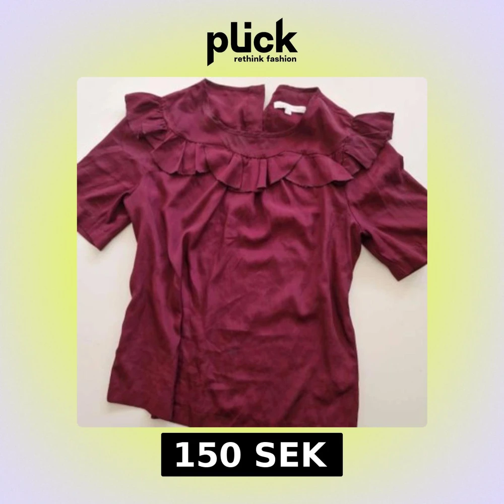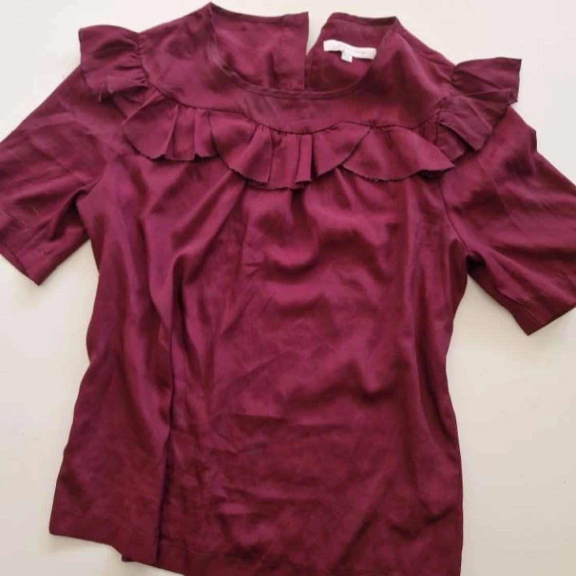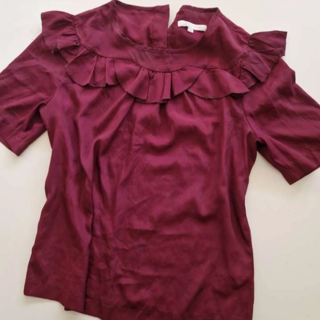 Supersöt vinröd blus med korta ärmar och volang er.