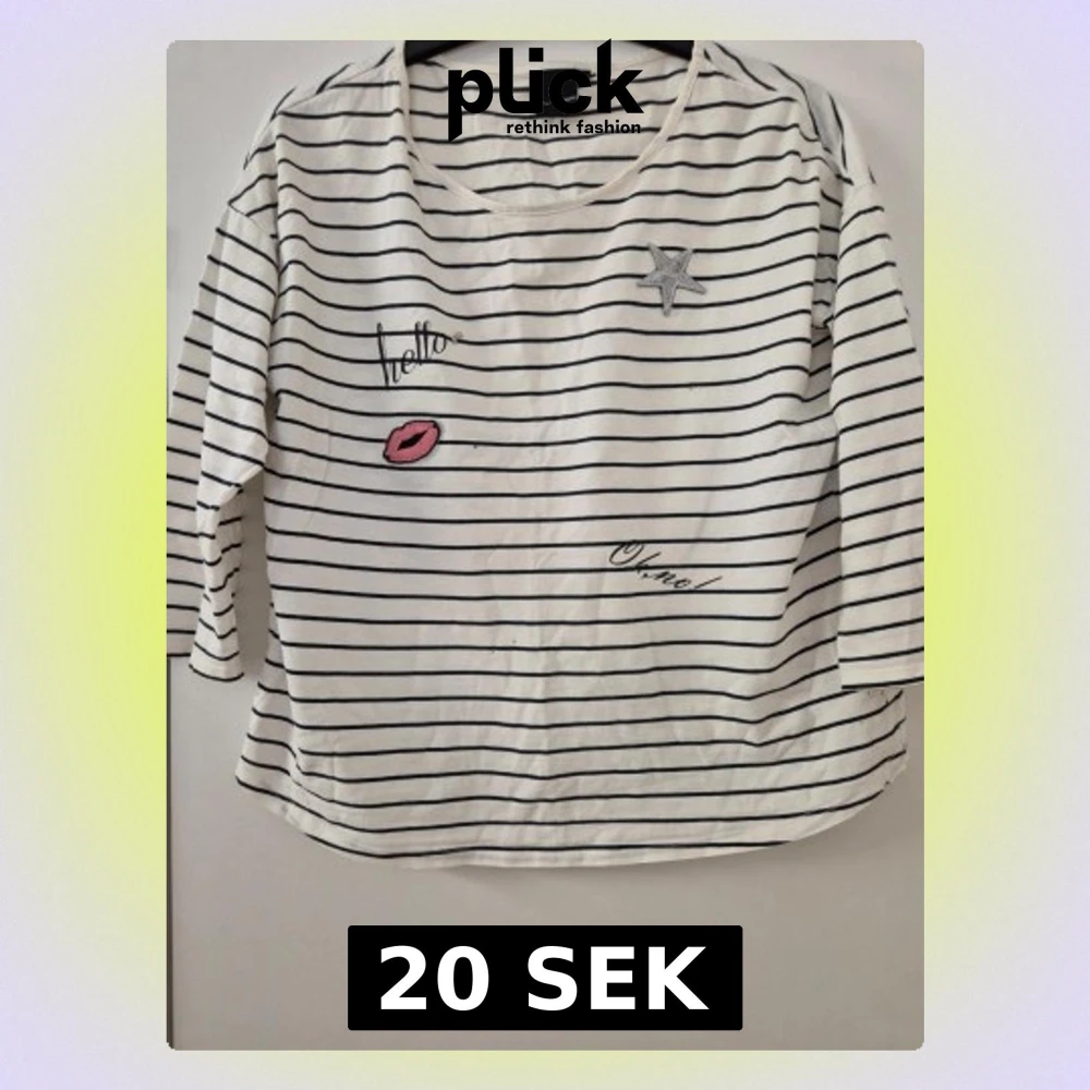 Vit tröja med svarta horisontella ränder från Kappahl. Tröjan har broderade detaljer som en stjärna, ett par röda läppar och texten 'hello' och 'oh la la' på framsidan. Rund halsringning och trekvartsärm. Tillverkad i mjukt bomullsmaterial. Har några hål och lite gult underarmarna.
