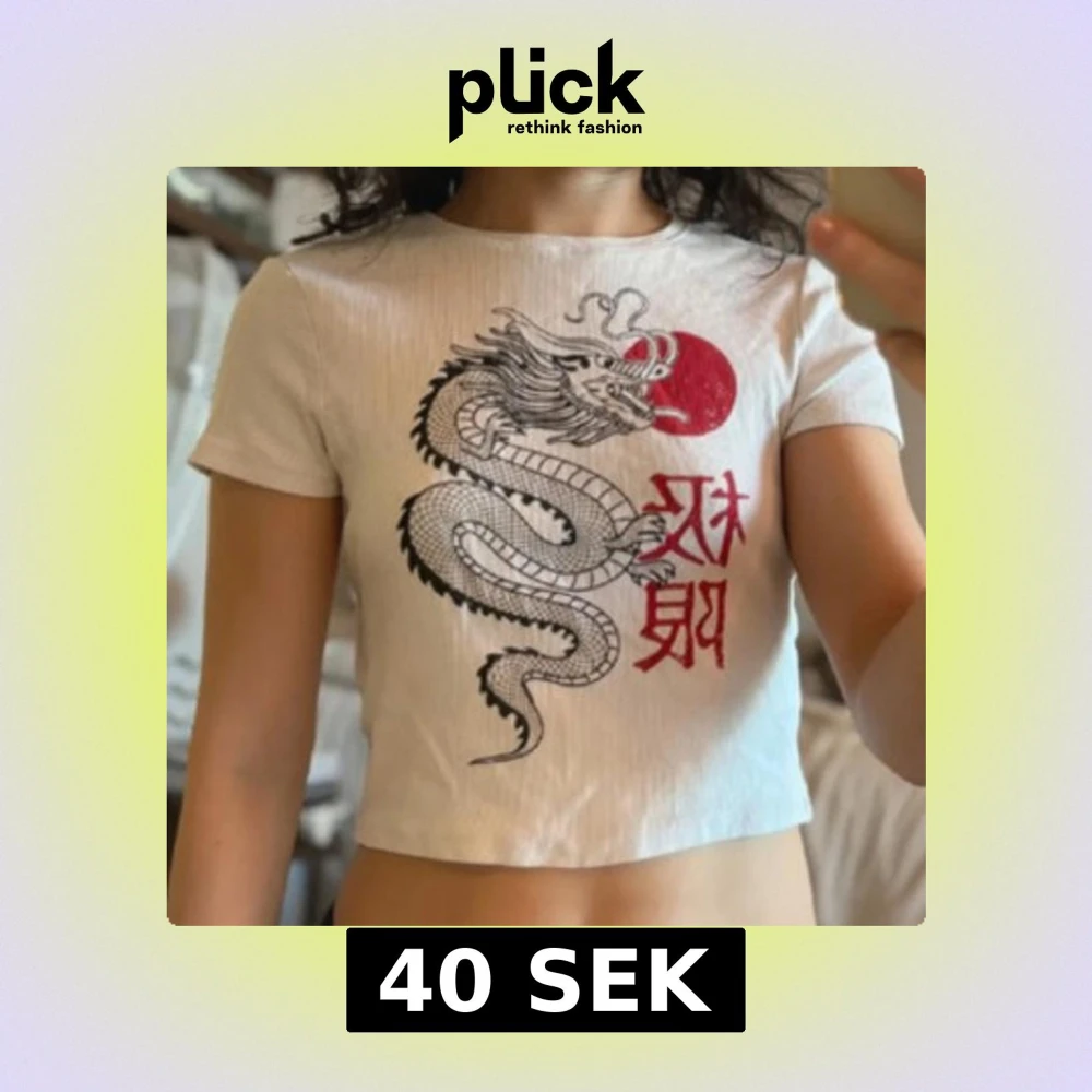 Cool vit ribbad topp med korta ärmar och ett stort svart drakmotiv framtill, röd sol och japanska tecken. Perfekt för dig som vill sticka ut med en edgy vibe och streetstyle-inspirerad look.