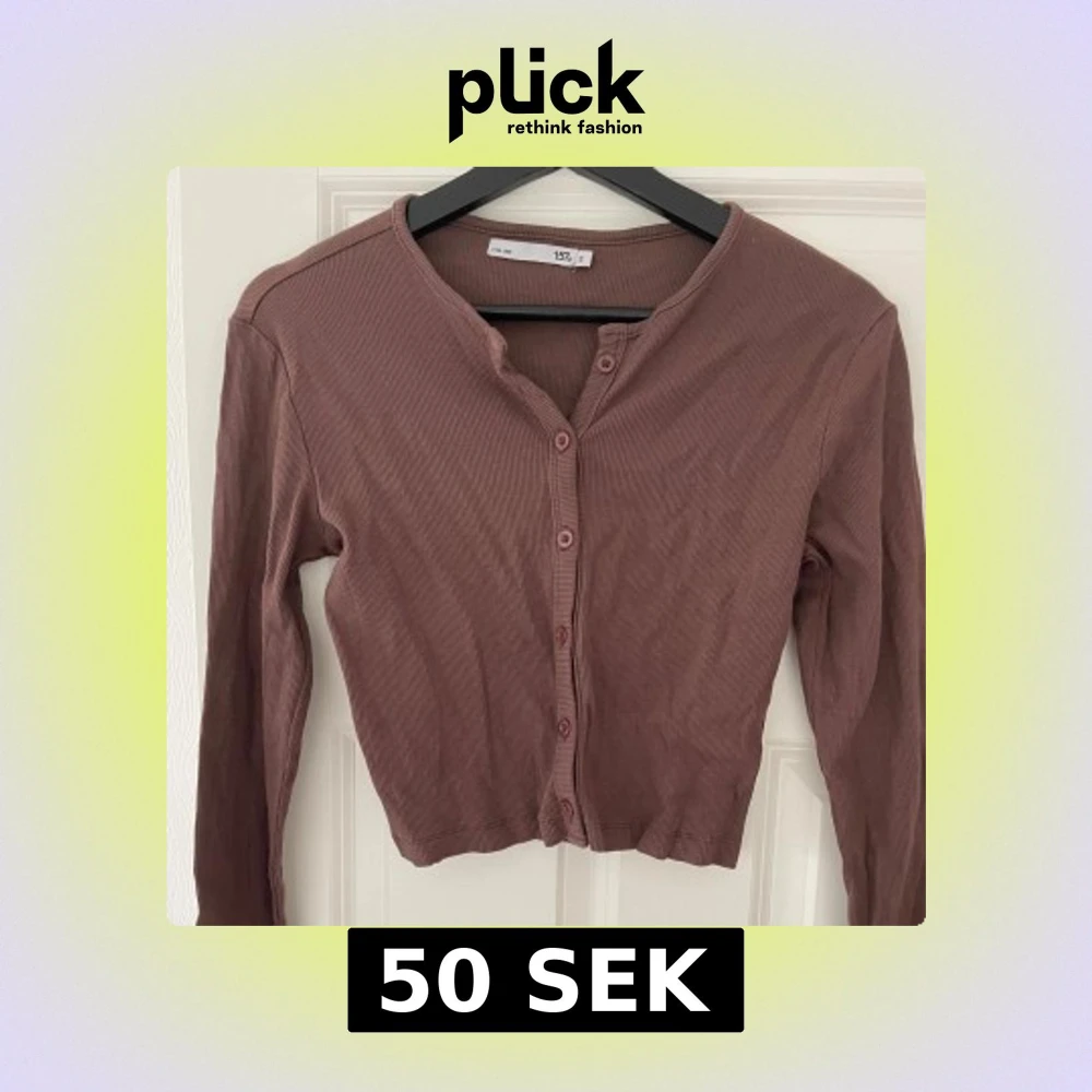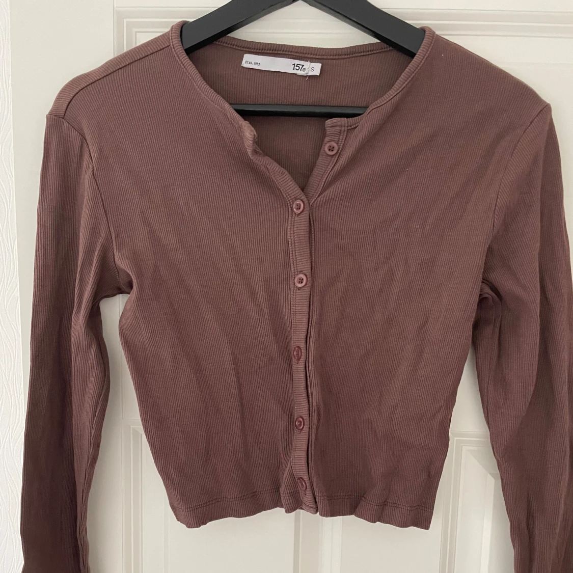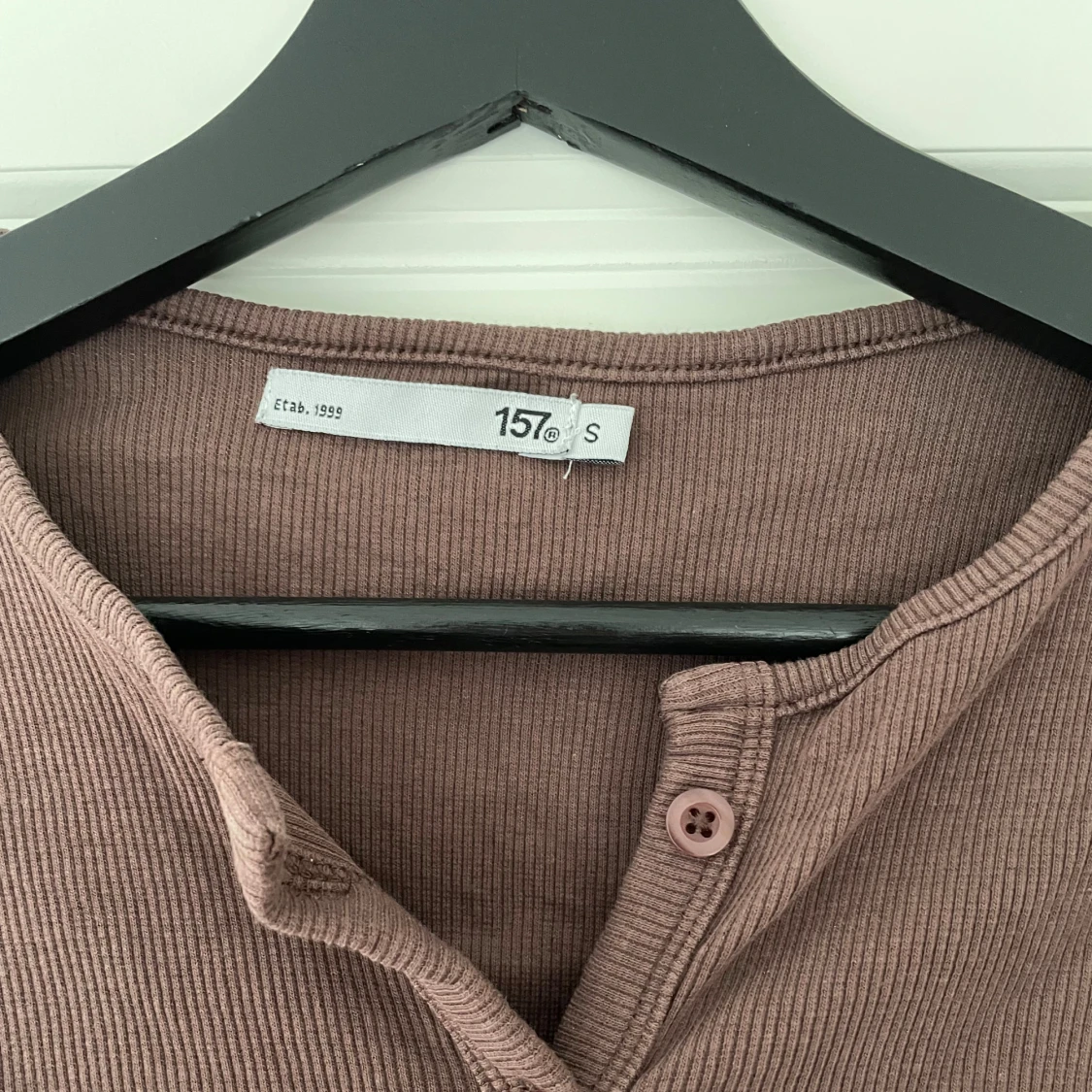 Säljer en brun ribbad topp från 157 med lång ärm och knappar framtill. Modellen är croppad och har en rund halsringning.❤️