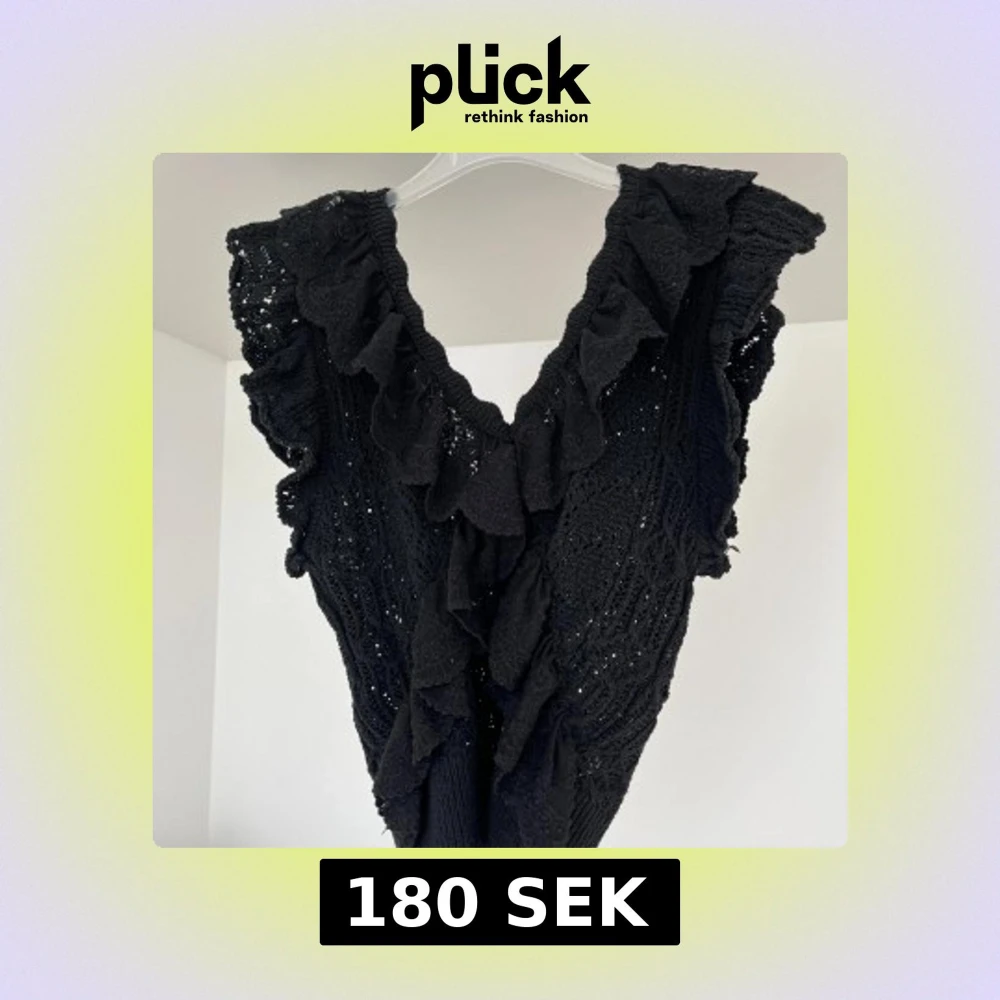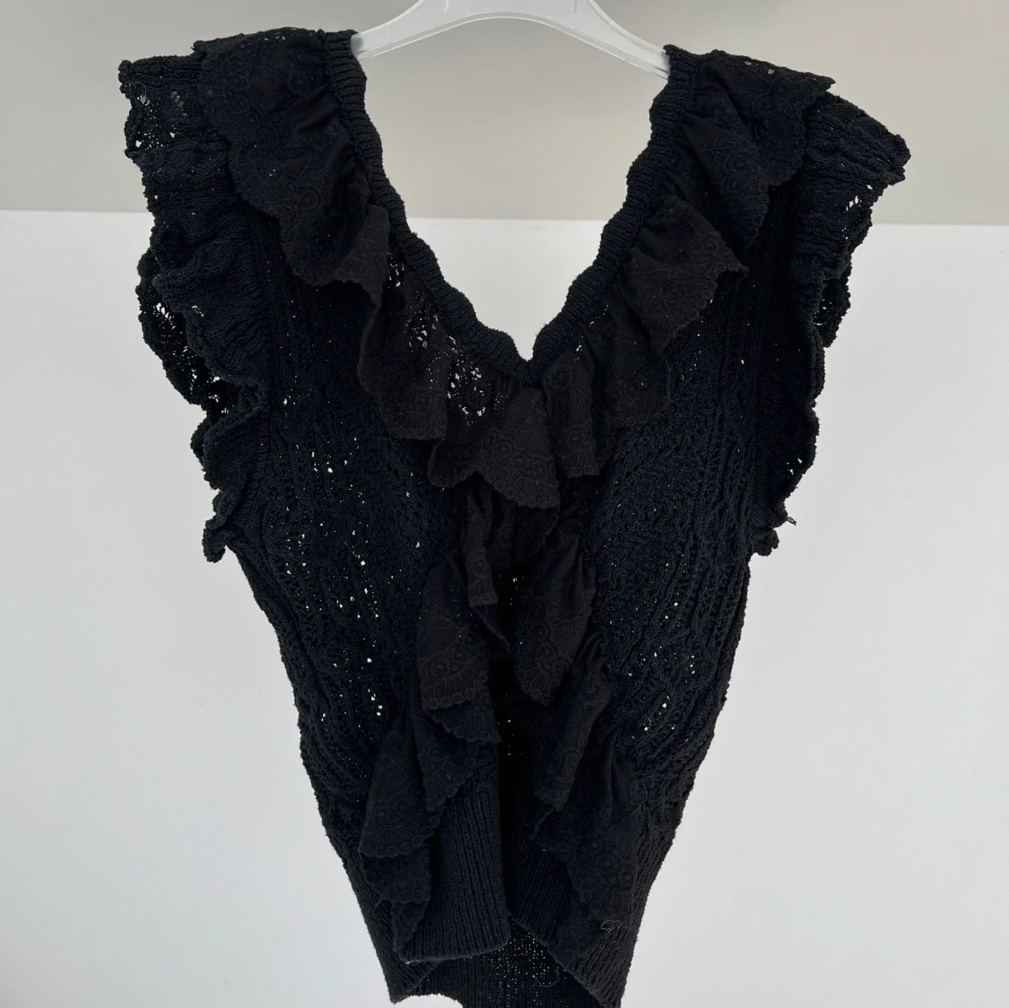 Säljer en svart topp med djup v-ringning och volanger längs halsringningen. Toppen har spetsdetaljer och är ärmlös, perfekt för att lyfta vilken outfit som helst.