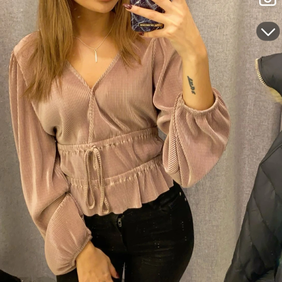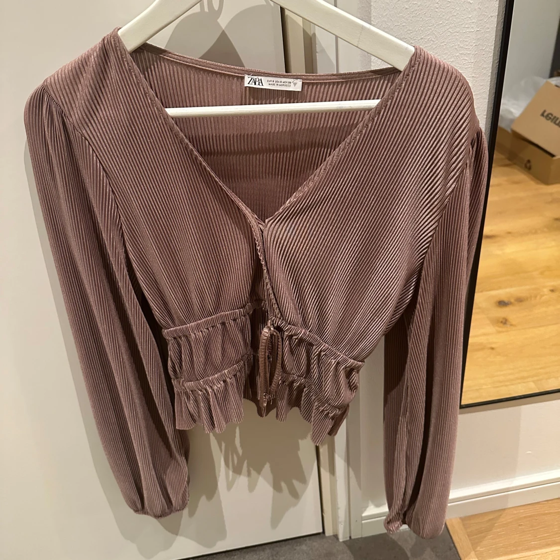 Säljer en snygg ribbad lila blus från Zara med v-ringning och långa ärmar. Blusen har en knytning i midjan och volangdetaljer vid nederkanten. Perfekt för en stilren look.