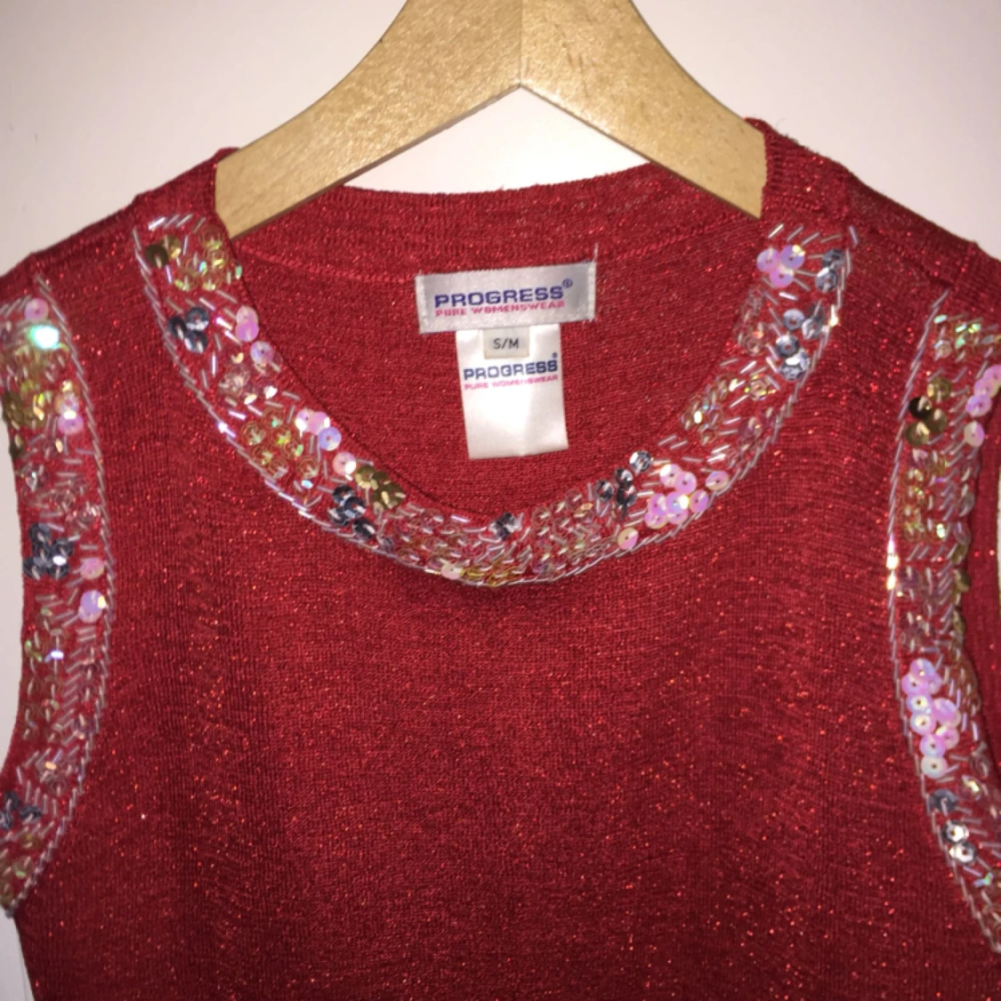 Glittrig stickad röd topp med paljettkrage. Strl S/M. Knappt använd.