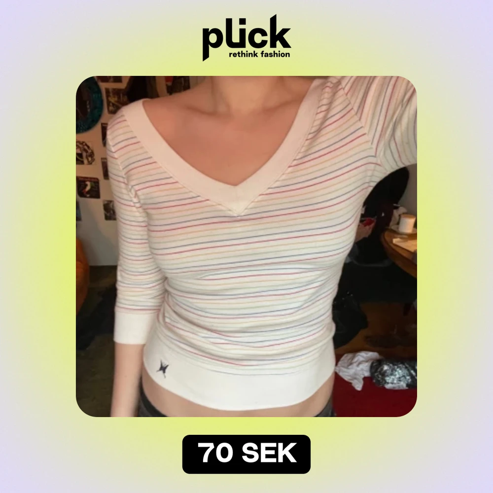 Supersöt vit topp med flerfärgade tunna ränder💗 sitter superbra, fin v-ringning i fram och bak, bra skick. Meddela vid funderingar!