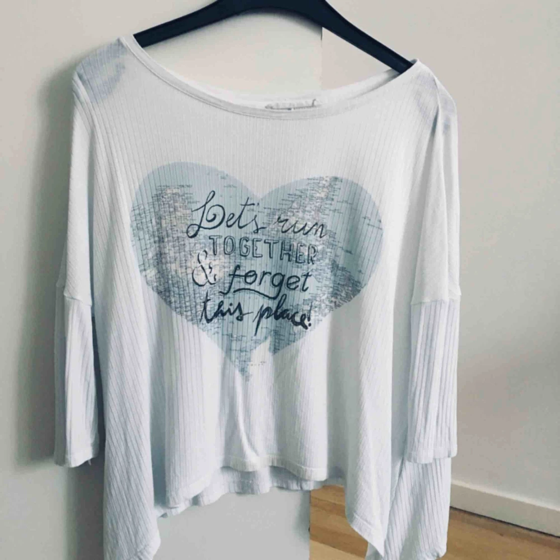 Tröja från Bershka med fint tryck i lös passform, aningen croppaf . 3/4-ärmar! Bra skick, endast använd fåtal gånger men tyvärr för lite för mig