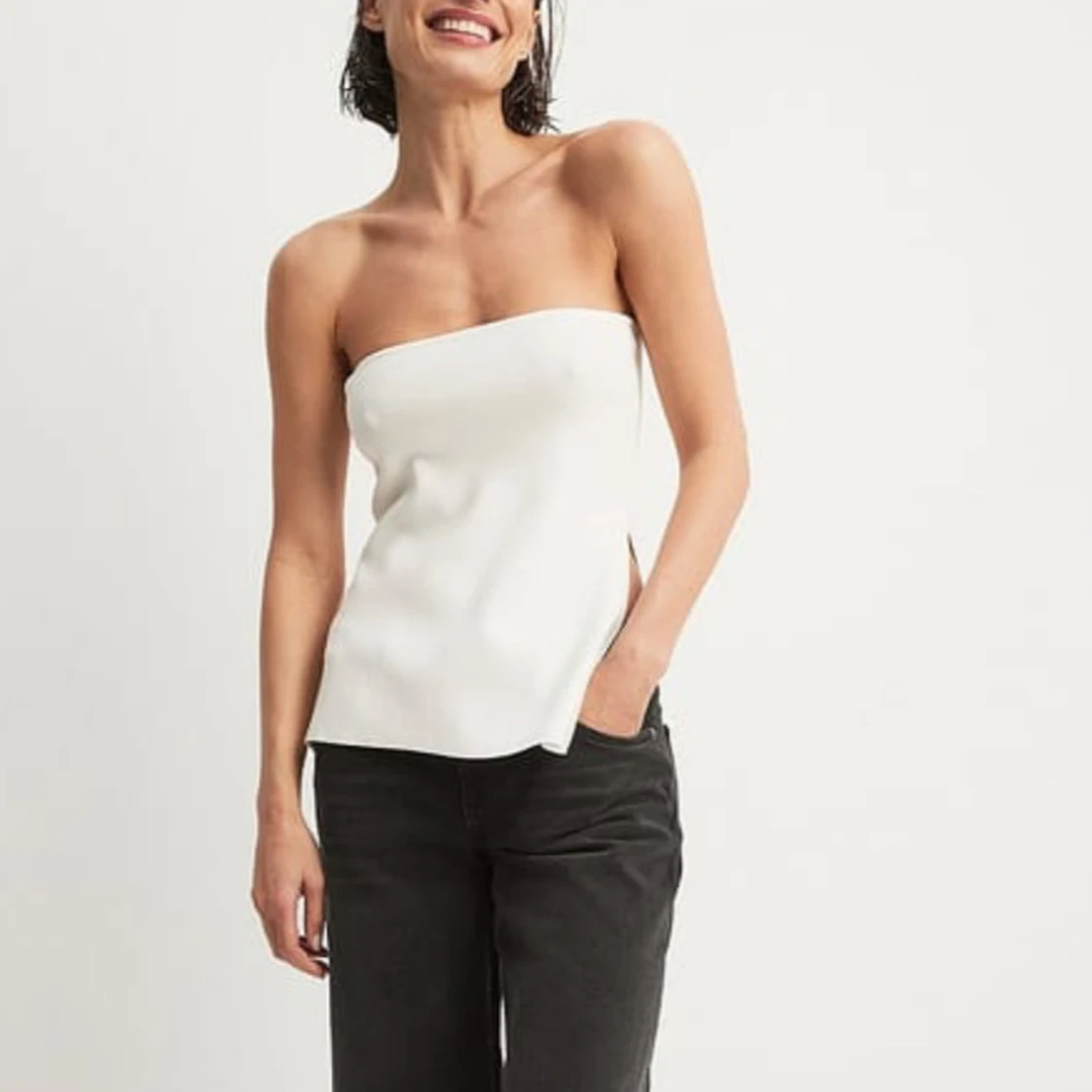 Vit tube top med slit i storlek M. Beställde den från NAKD men har aldrig använt den då den inte passade mig, lappen sitter kvar. Bilderna är tagna från NAKD. Hör av er ifall ni har frågor eller vill ha fler bilder🫶🏼