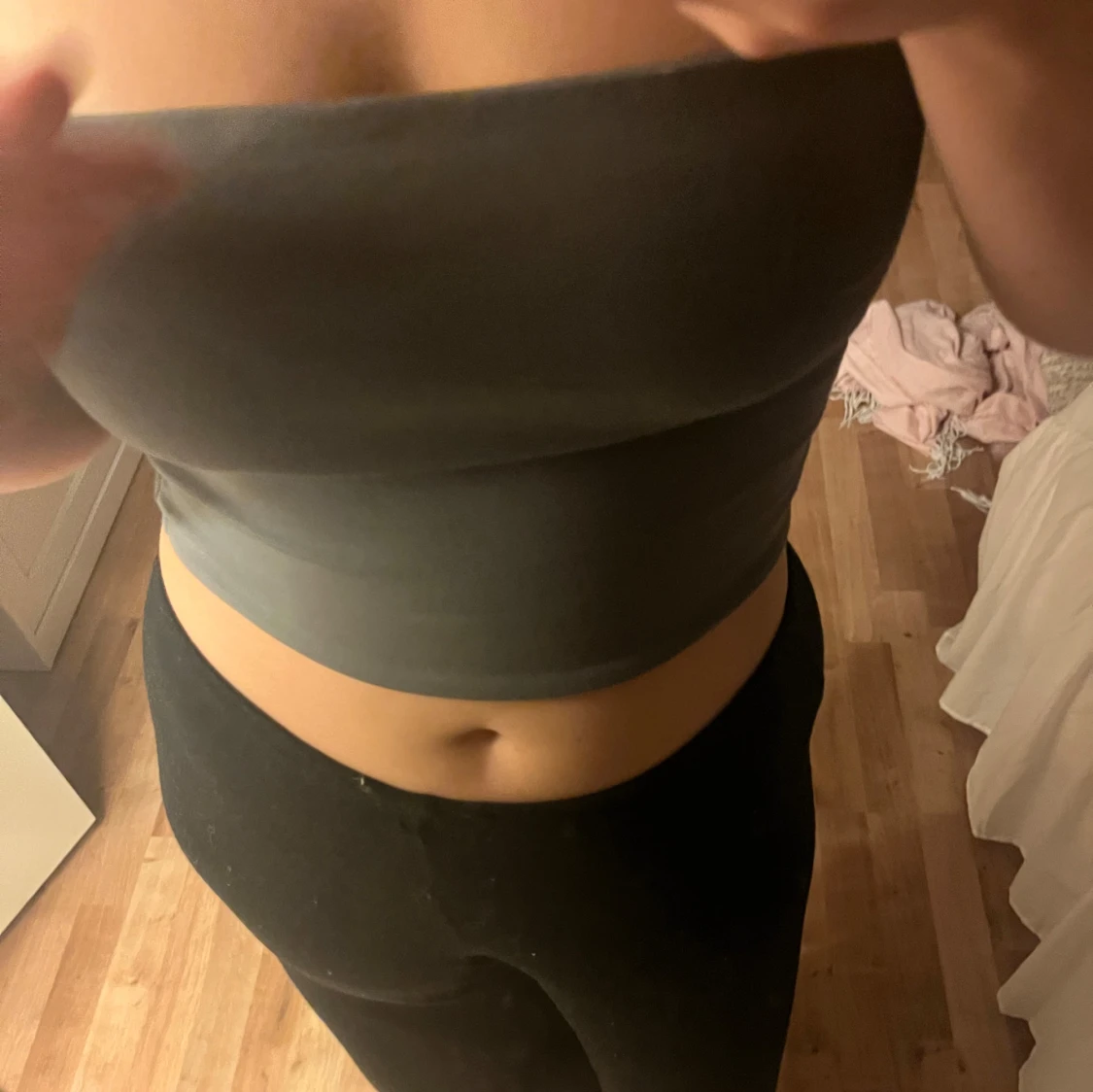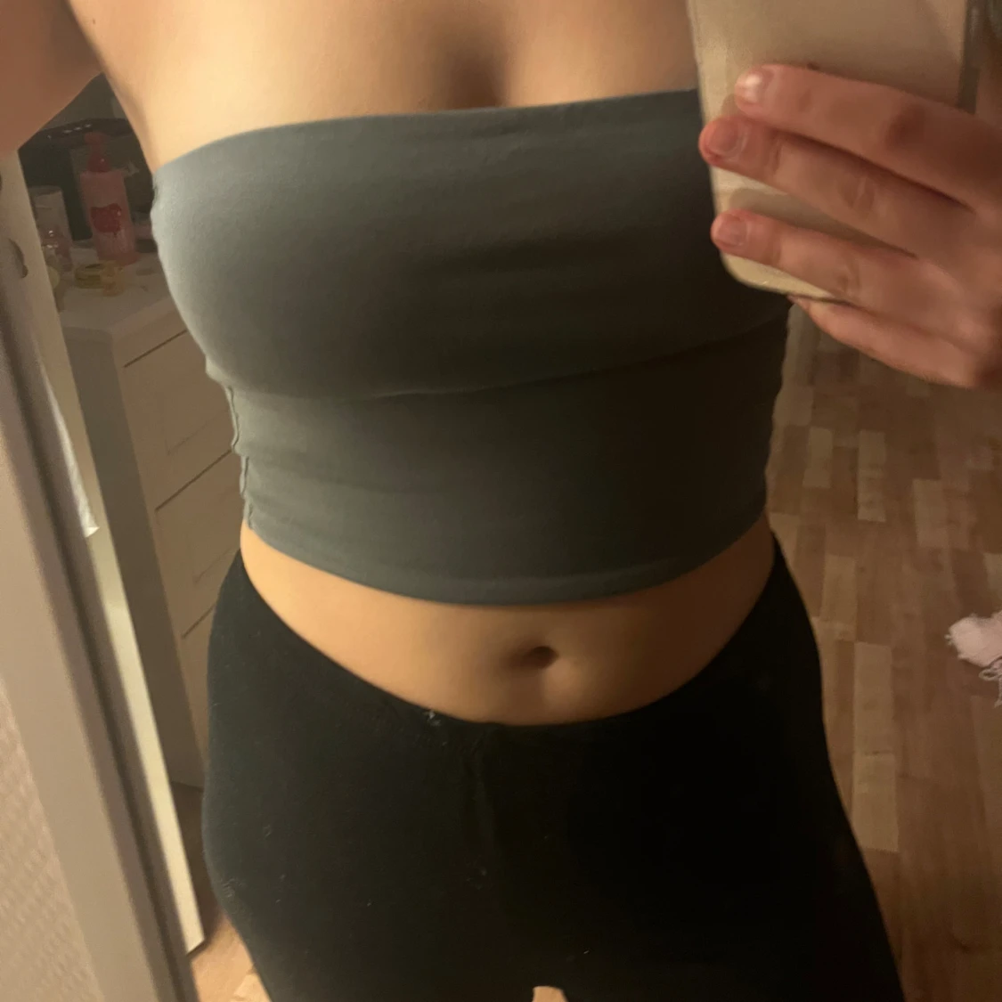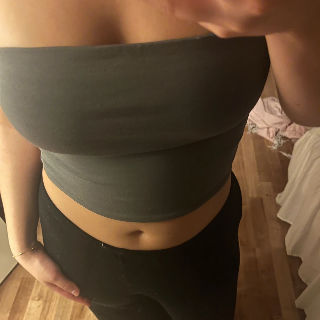 Säljer en enkel och stilren mörkgrå bandeau tubtopp. Toppen är axelbandslös och croppad, perfekt att matcha med höga byxor eller kjol. Mjuk och stretchig för en tight passform. Passar dig som gillar minimalistisk stil.