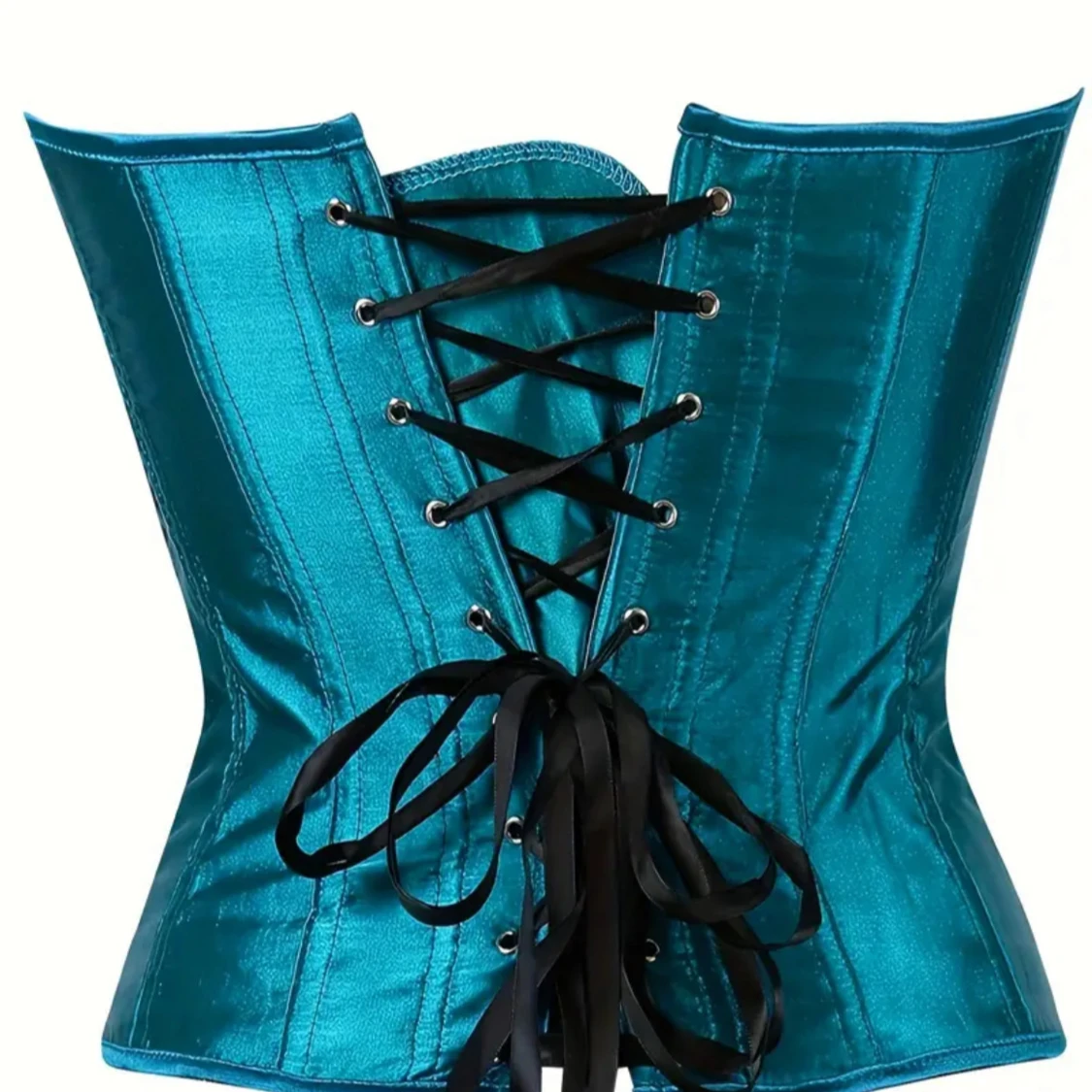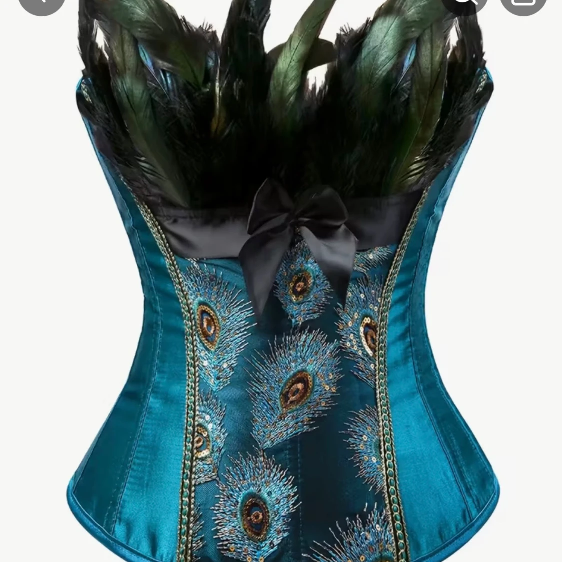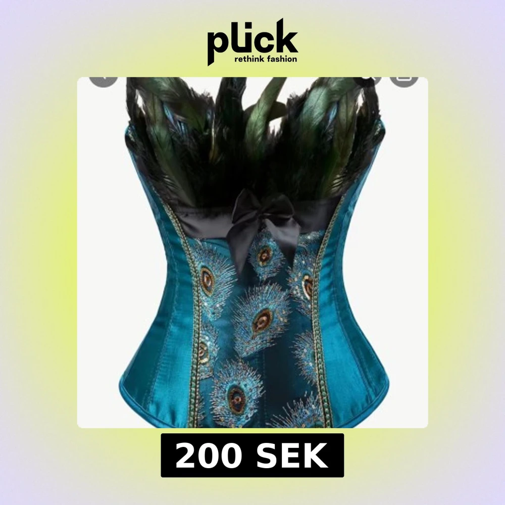 Unik turkos korsett med glansig satinlook, broderade påfågelsmönster i blått och guld, och svarta fjädrar upptill. Framtill sitter en svart rosett och baksidan har snörning med svarta band. Perfekt för dig som vill sticka ut med en extravagant stil.