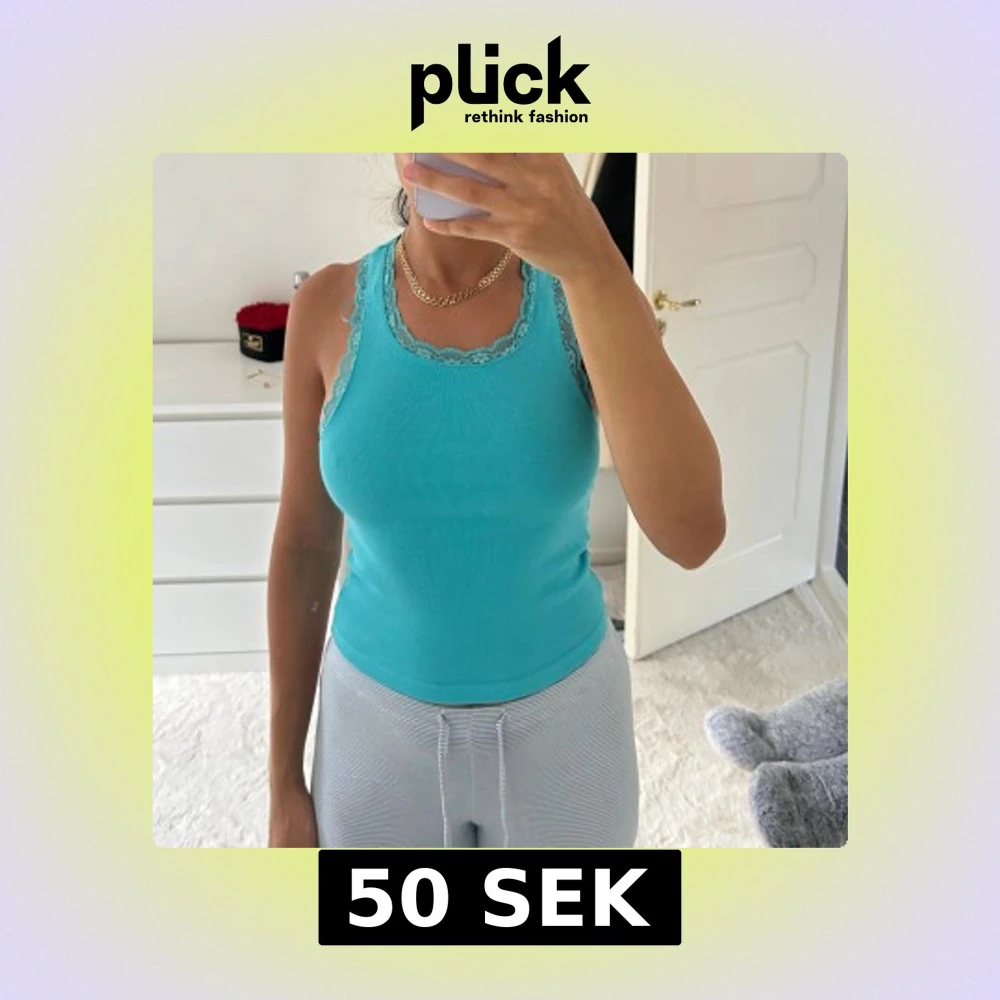 Säljer en turkos ärmlös linnetopp med fina spetsdetaljer längs halsringningen och ärmhålen. Toppen är figurnära och har en enkel, stilren design som passar perfekt till sommaren. Materialet känns mjukt och stretchigt.
