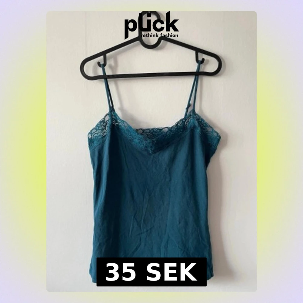 Turkos linnetopp med tunna axelband och dekorativ spetskant upptill.