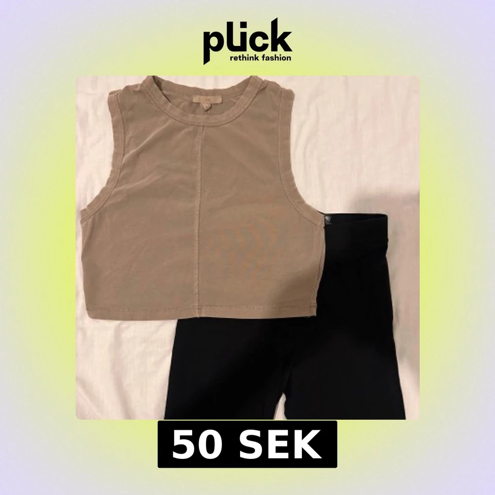Säljer en stilren beige ärmlös croppad topp och svarta leggings. Perfekt för varma dagar Enkel design med rund halsringning. Topp, storlek S/M , leggings storlek XS/S
