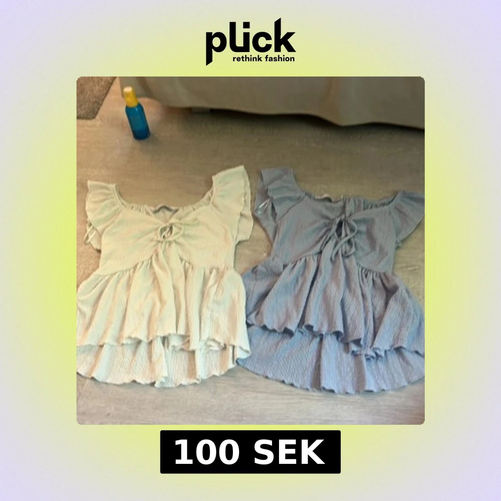 Säljer två söta korta volangtröjor från 157, ena i storlek S och andra i XS. En är ljusbeige och en är ljusblå, båda med knytning fram, volanger och kort ärm. Perfekta för sommarens alla tillfällen och superbekväma i mjukt, krinklat tyg.
