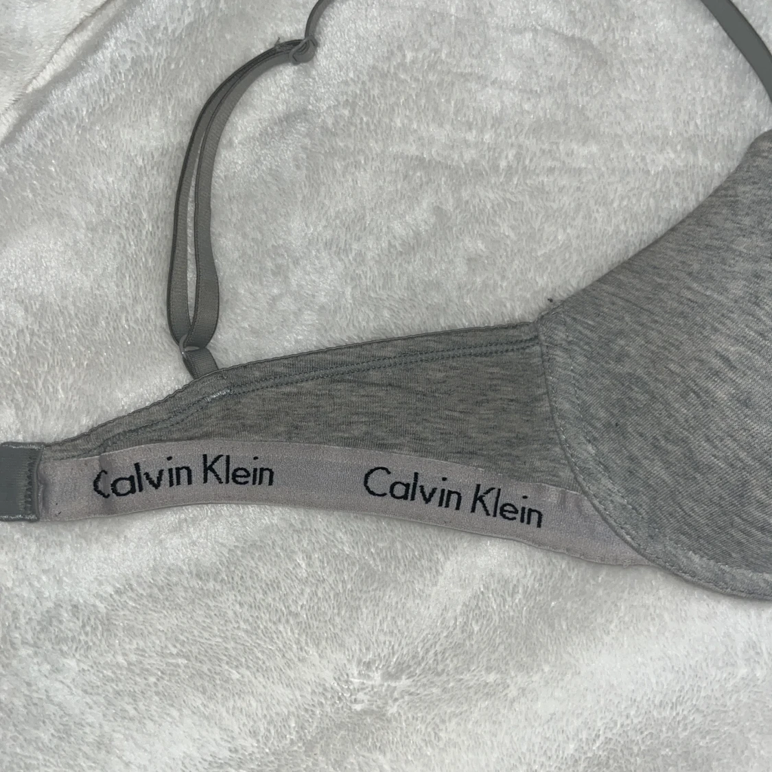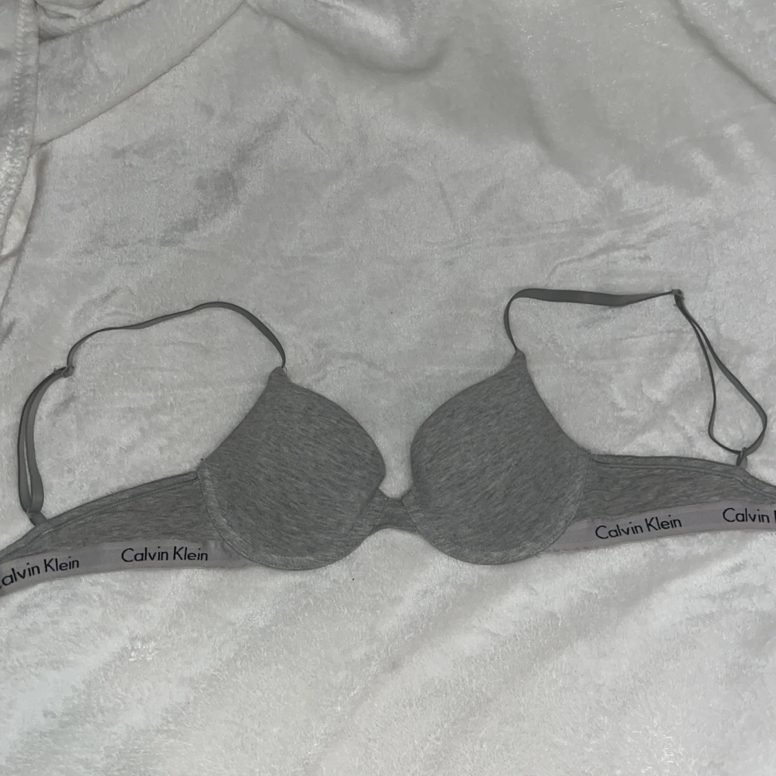 Säljer en grå bh från Calvin Klein med märkets logga på resåren. Bh:n har justerbara axelband och en mjuk, bekväm passform. Perfekt för vardagsbruk.