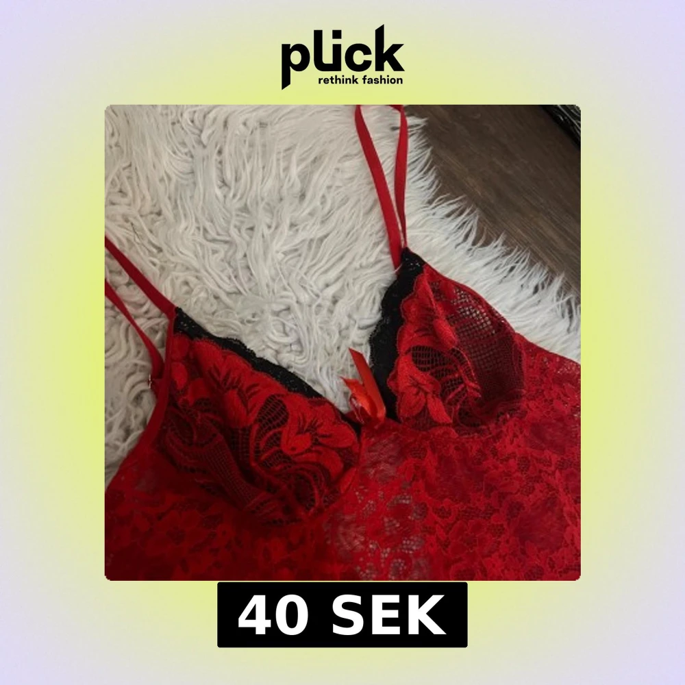 Säljer en röd spetsig nattlinne med svarta spetsdetaljer vid bysten och små rosetter framtill. material är genomskinlig spets med blommigt mönster och smala justerbara axelband. Knappt använd!