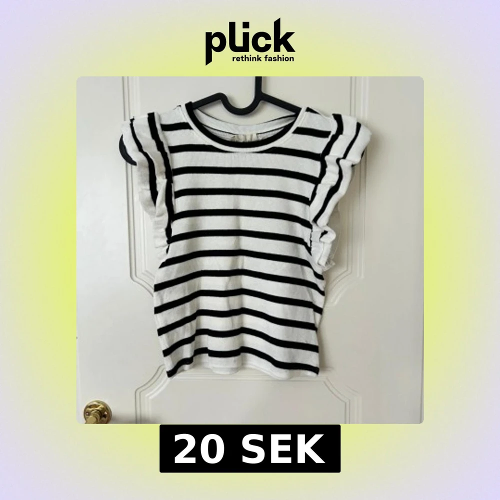 Säljer en vit och svart randig topp från Uniqe studios med breda volangärmar. Ribbad struktur och rund halsringning ger en chill vibe. Perfekt för dig som gillar statement-ärmar och klassisk stil. Passar till jeans eller kjol för en cool look.