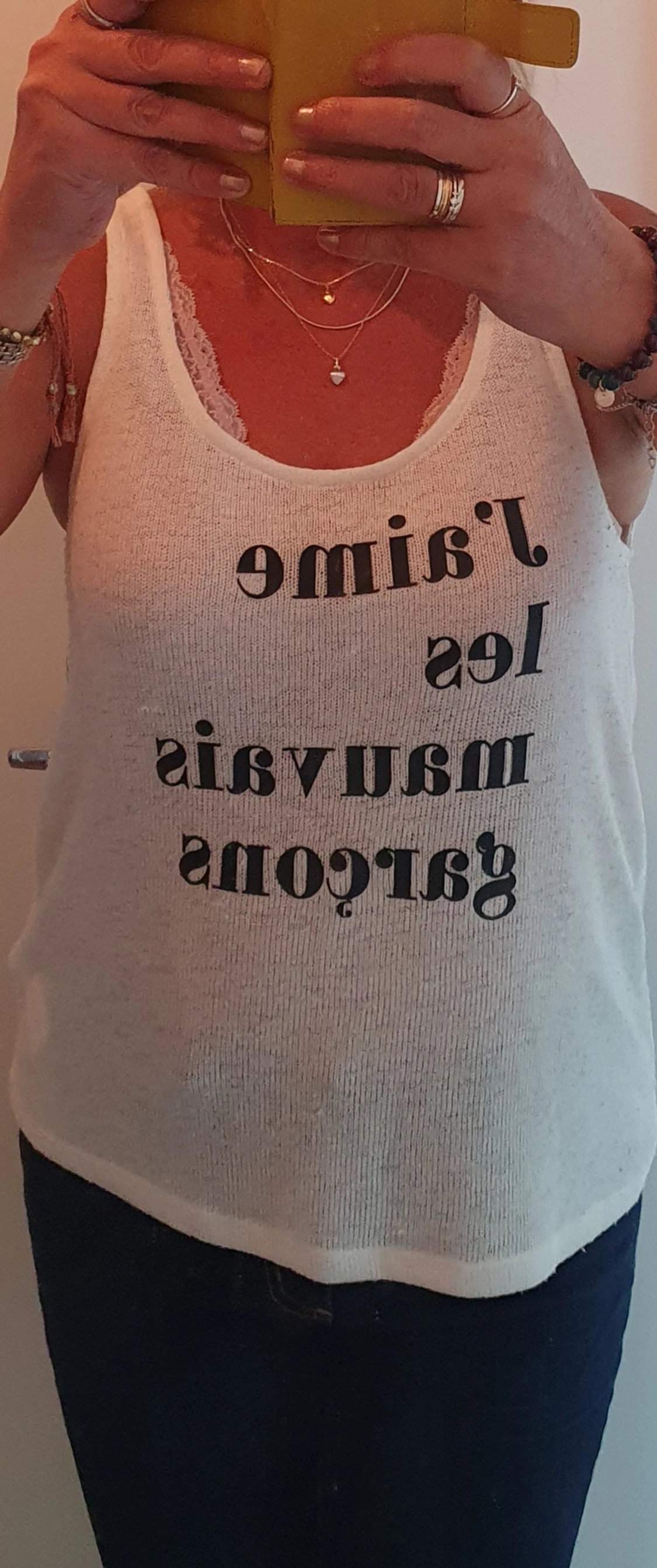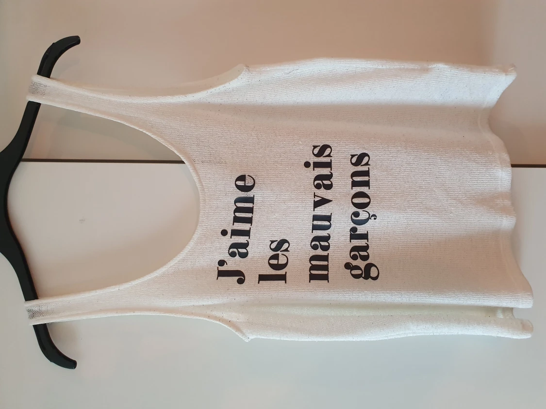 Finstickat vittlinne med svart text på franska som översatt betyder "jag gillar bad boys" Strl M finns ej att köpa längre. Pris 100kr