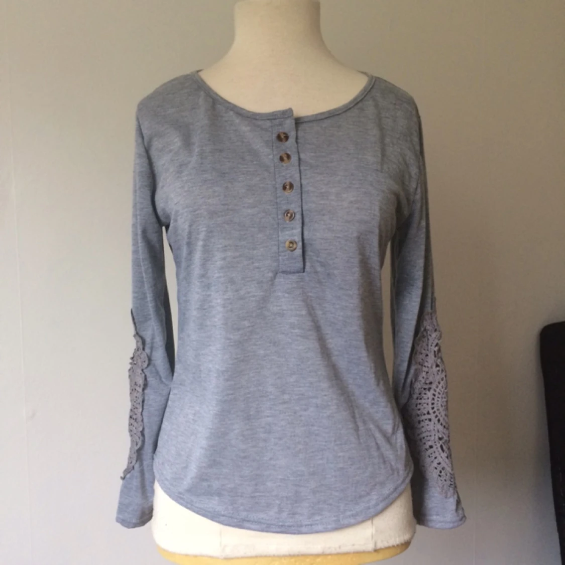 Tröja med spetsdetaljerade ärmar och knapprad från halsringningen. Frakt ingår ej, kan mötas upp i Stockholm