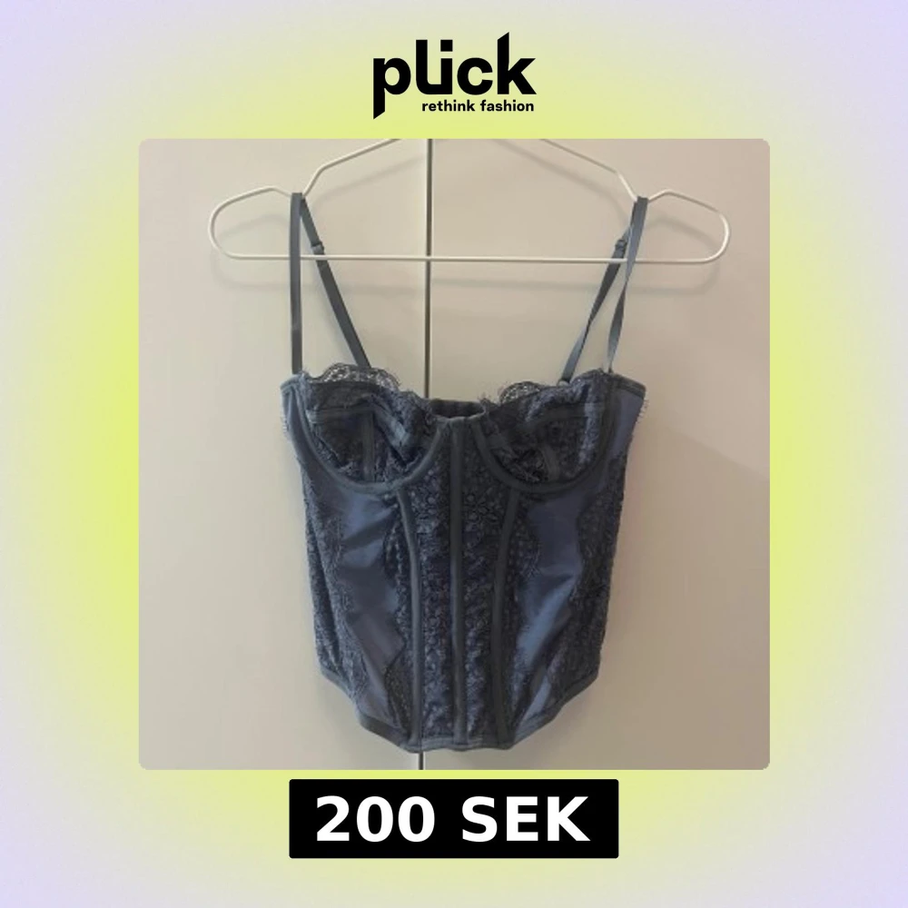Supersnygg blå korsett med spetsdetaljer och smala justerbara axelband. Toppen har markerade sömmar och hakknäppning bak. Köpt på plick.