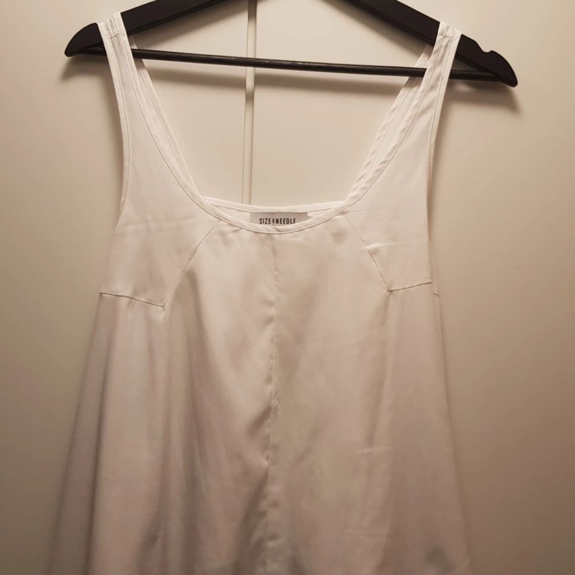Vitt linne med lagom breda band, figursydd runt bysten men lös och en vågig skurning i botten. Urringad.