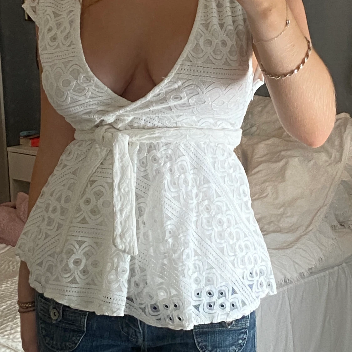 Jättefin vit spetstopp med knytning, står att den är i storlek xl men skulle säga det passar som en M💕