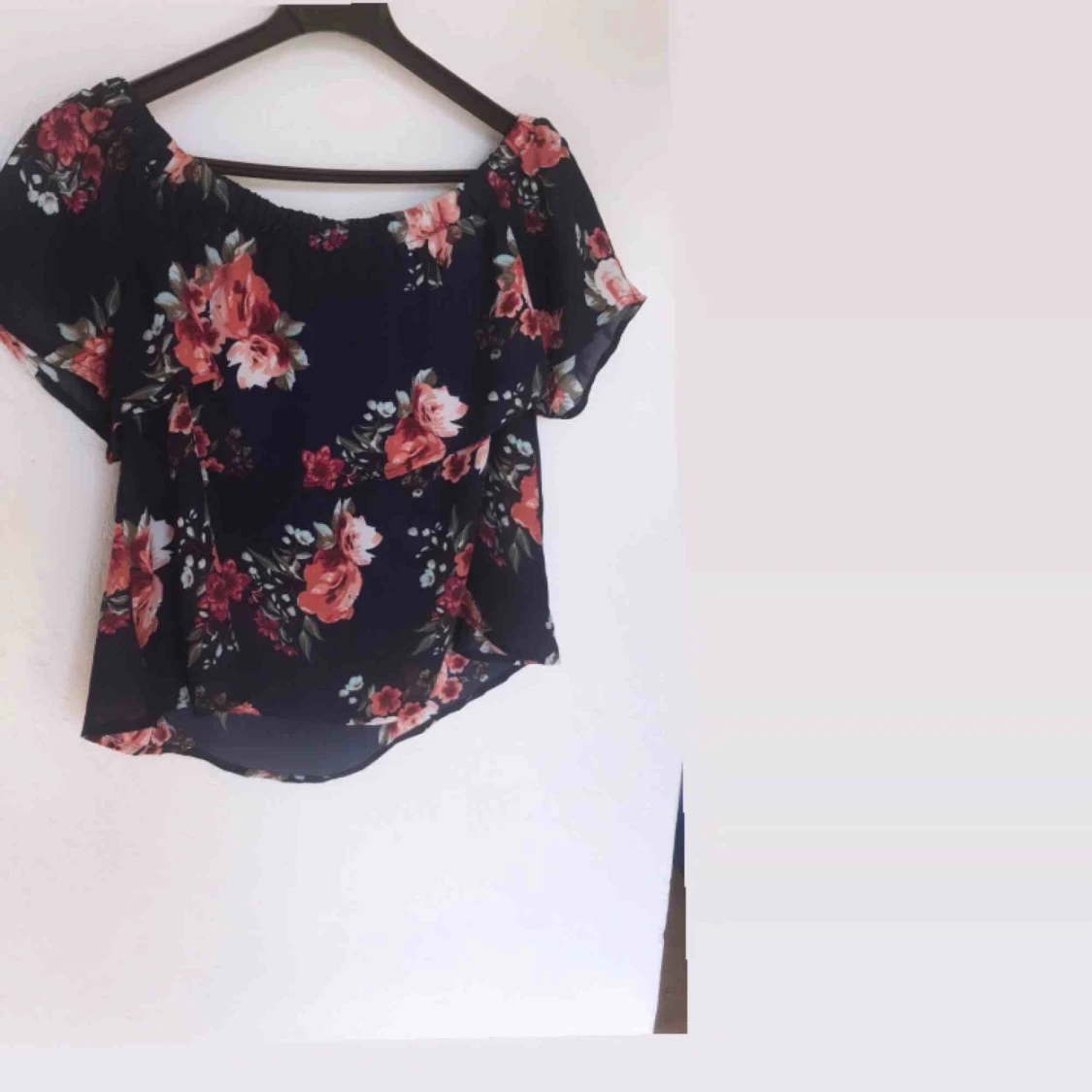 Fin blå sommartopp med blommor. Bärs med synliga axlar. Fin till kalas eller när man vill vara sommarfin.