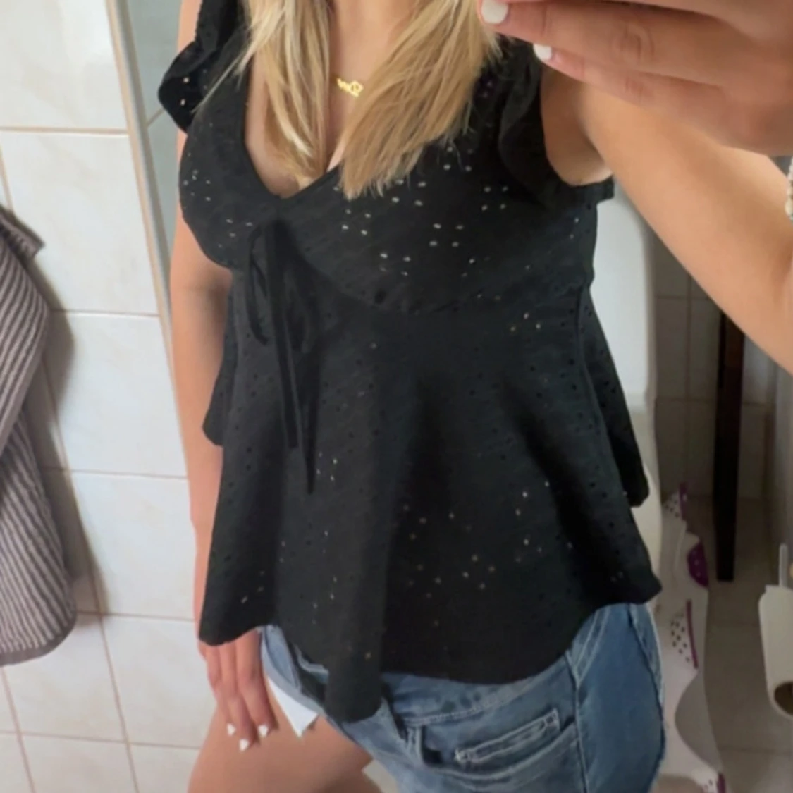 Supersöt svart blus med v-ringning, volangärmar och knyt framtill.