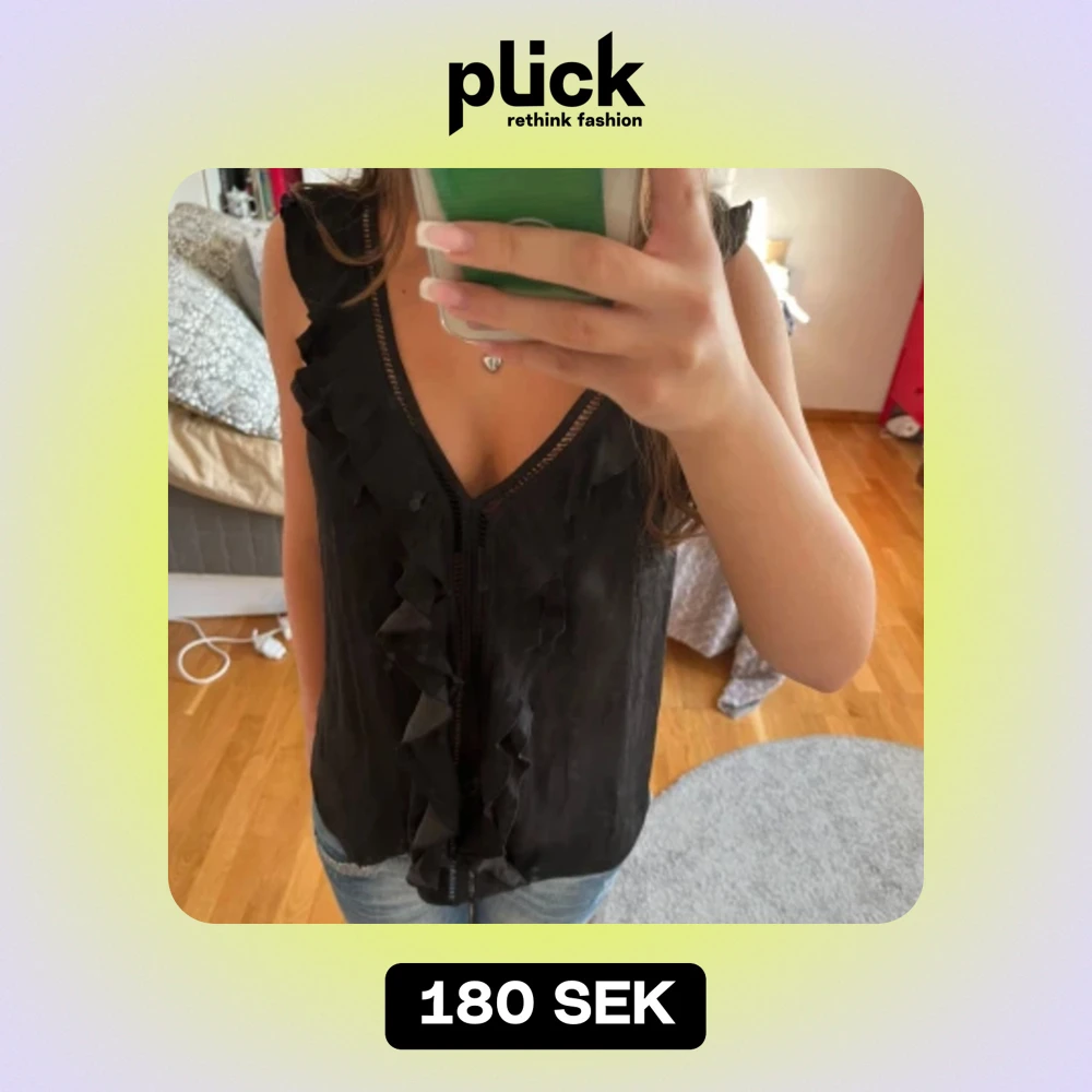 Säljer en snygg svart ärmlös topp från H&M. Den har en v-ringad design med fina volangdetaljer längs framsidan. Perfekt för både vardag och fest!
