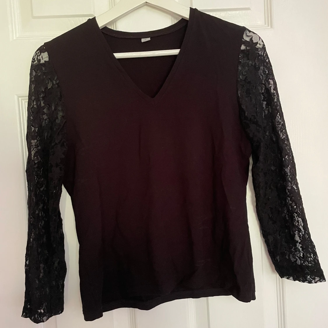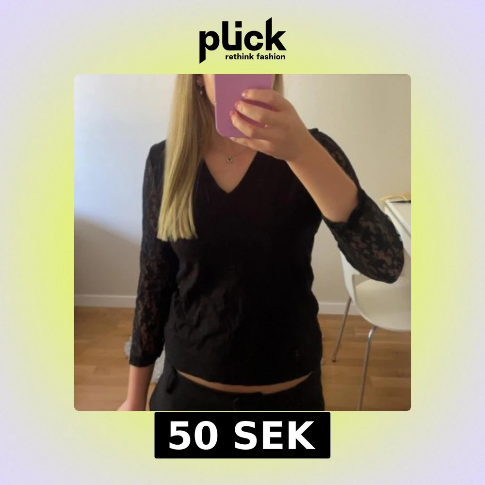 Svart blus med v-ringning och genomskinliga spetsärmar i trekvartsmodell. Toppen har en stilren look med åtsittande passform och är tillverkad i en mjuk viskosblandning. Perfekt för dig som gillar detaljer och vill ha något extra till outfiten.