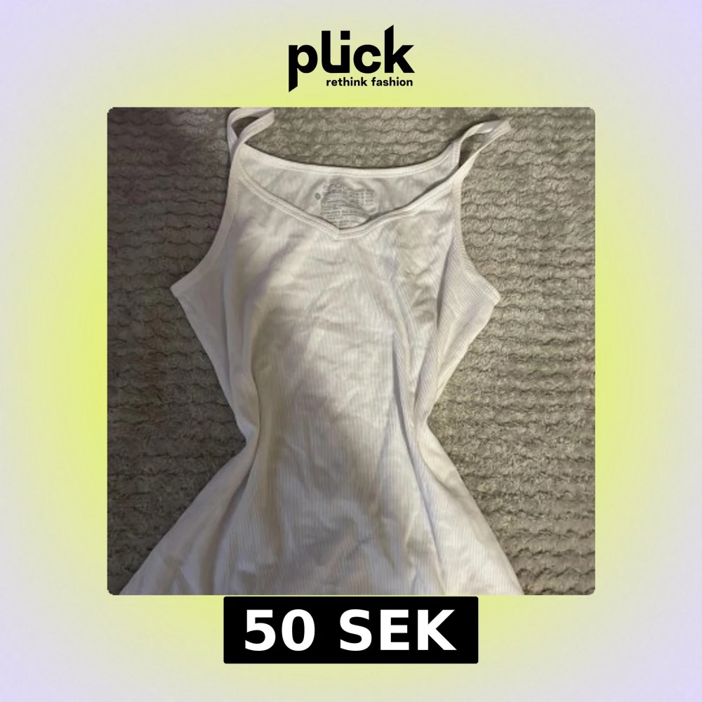 Säljer en stilren vit ribbad linnetopp med smala axelband och v-ringning. Perfekt för varma dagar eller som lager under en tröja. Enkel och mångsidig topp för din garderob.