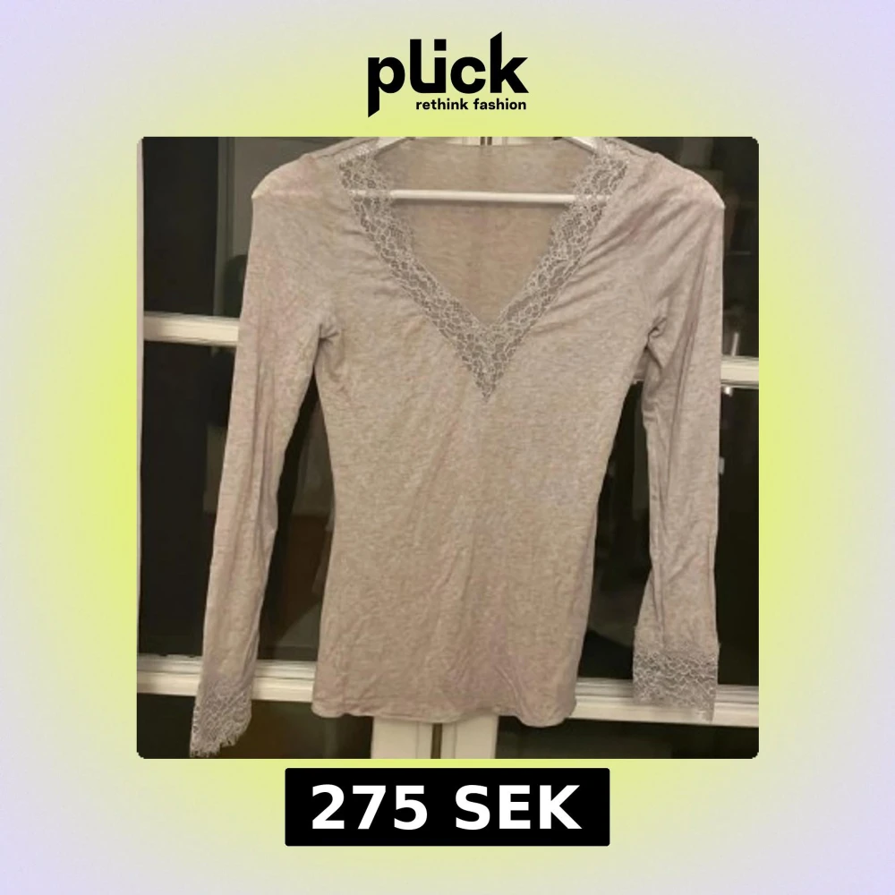 Supersöt ljusgrå långärmad topp med v-ringning och fina spetsdetaljer både vid halsringningen och vid ärmsluten. Toppens material känns mjukt och stretchigt, perfekt för en chill men ändå stilren look.