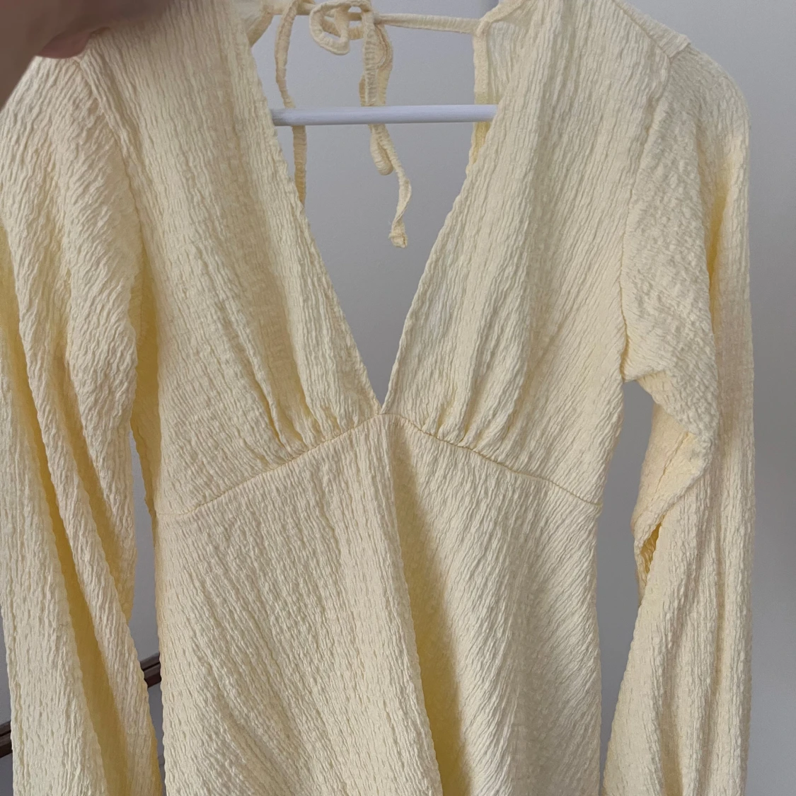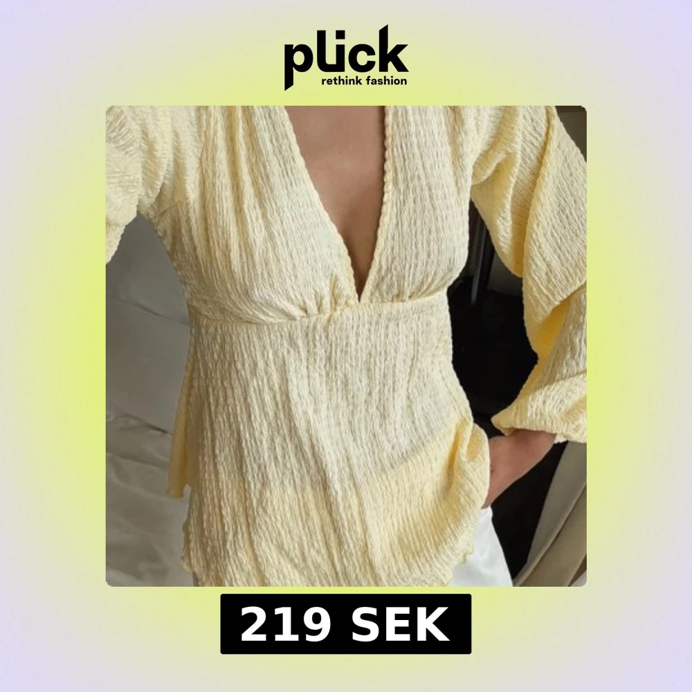Supersöt ljusgul blus i bomull med v-ringning fram och öppen rygg med knytband. Ääälskar denna men har tröttnat på färgen tyvärr. Från NAKD, storlek S. Helt oanvänd💛🍂