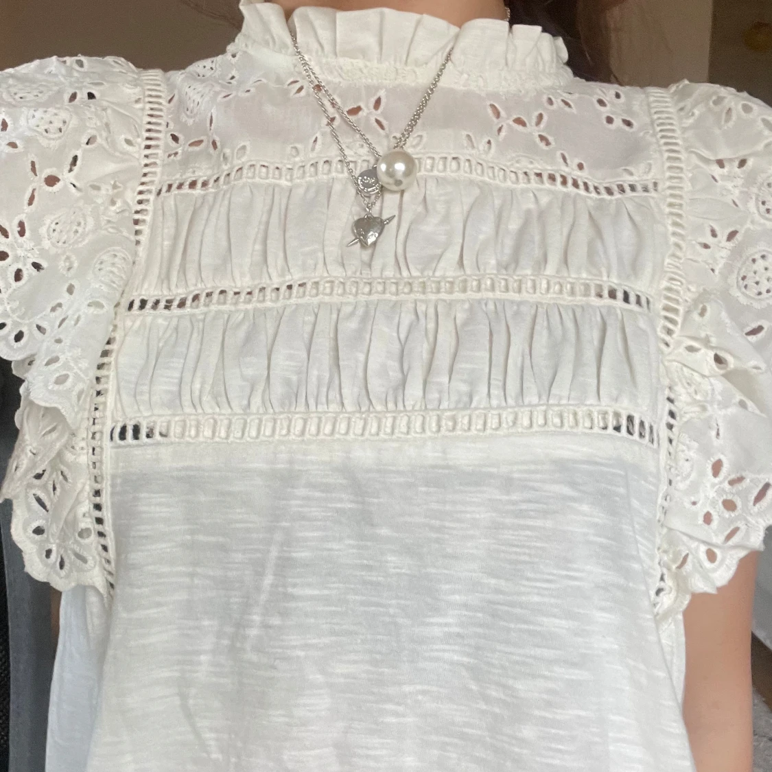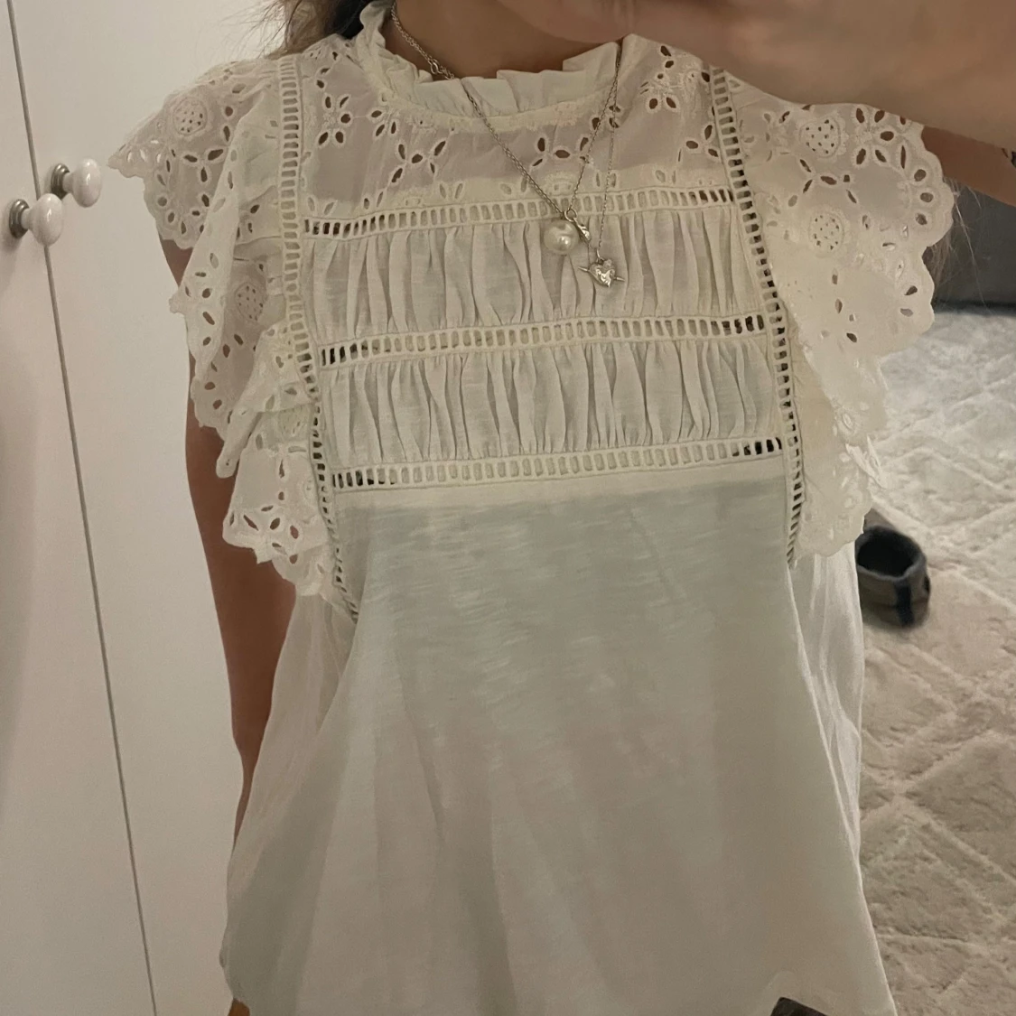 (INTRESSEKOLL) Gullig vit blus från Holly & Whyte med vackra spetsdetaljer och korta ärmar. Blusen är luftigt med broderade mönster och volanger vid ärmslut och hals. Perfekt för en somrig look! (Säljer vid bra pris) Endast testad💓