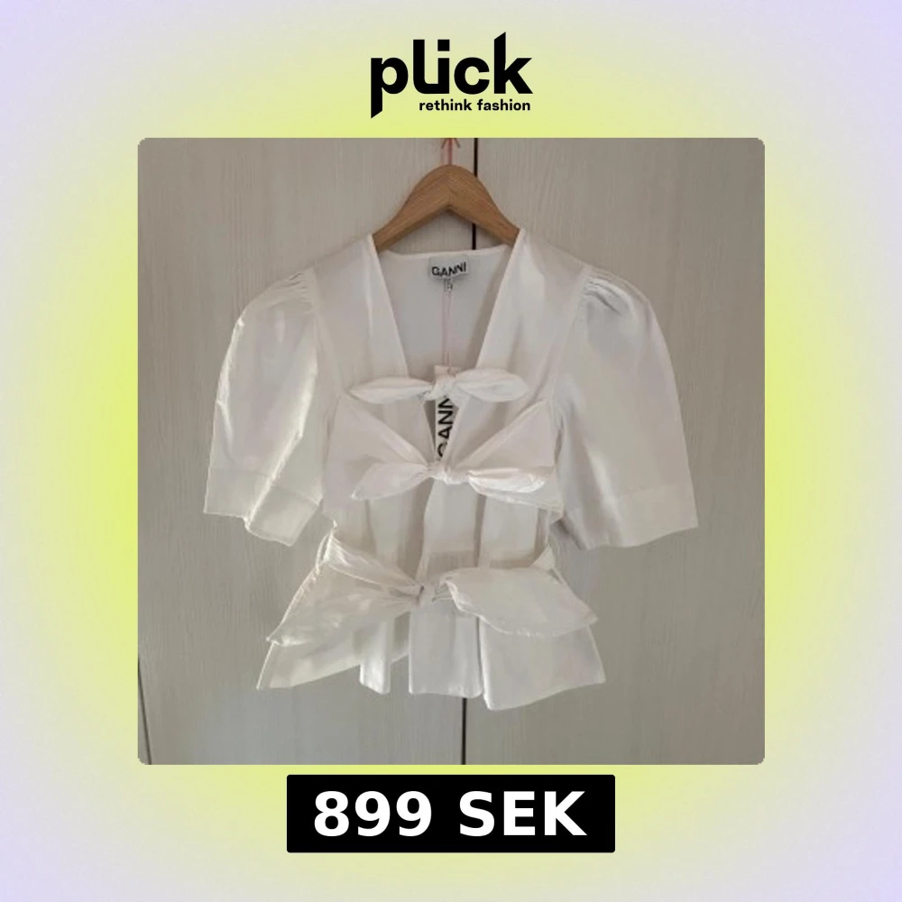 Helt ny, supersöt vit blus från Ganni med tre stora rosetter framtill och kort puffärm. Blusen har v-ringning och är super somrig. Den är storlek 42 men passar mig som oftast har storlek S/XS perfekt då man kan knyta den ❣️Nypris 2599 💗