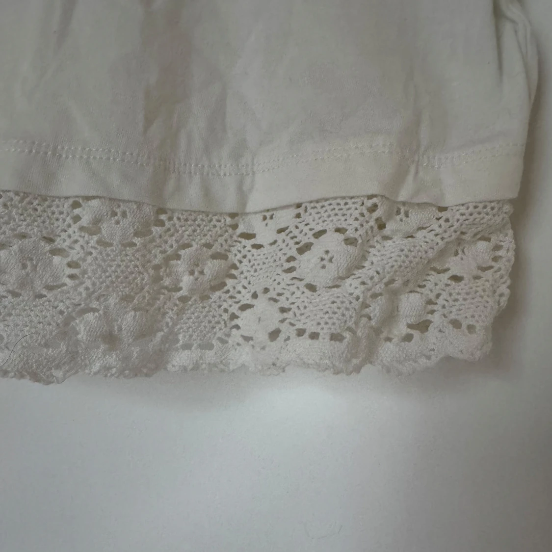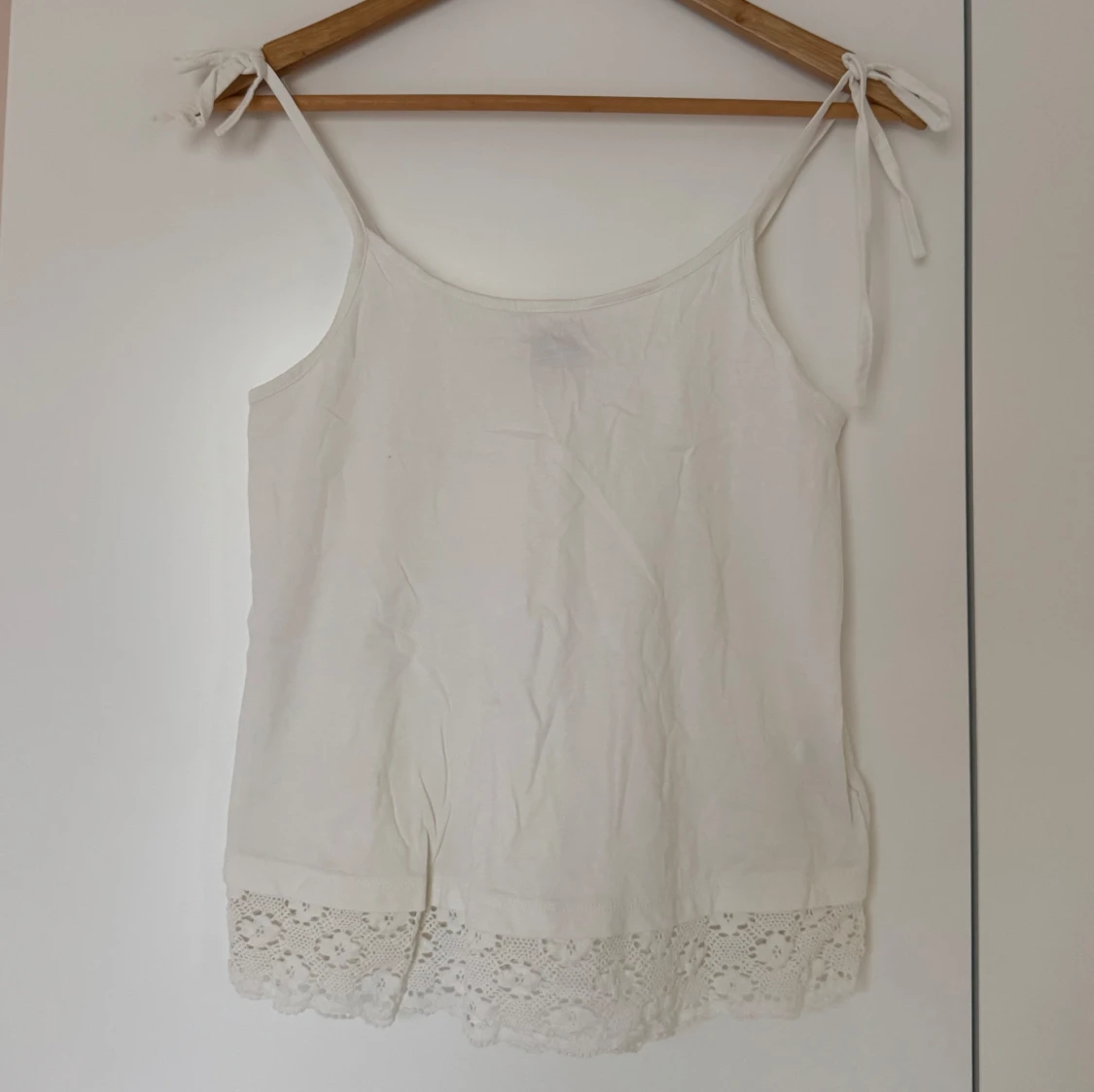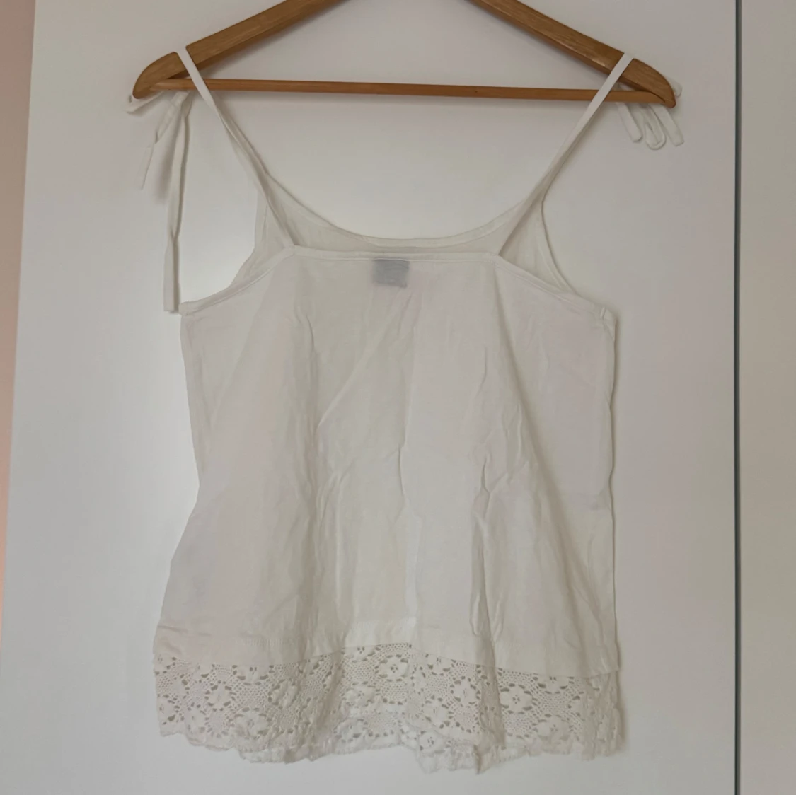 Vitt linne med smala axelband, knytning på axlarna och spetsdetalj längst ner.