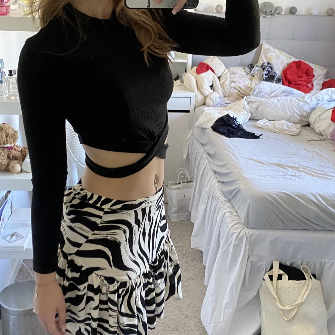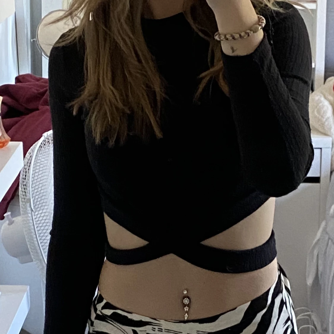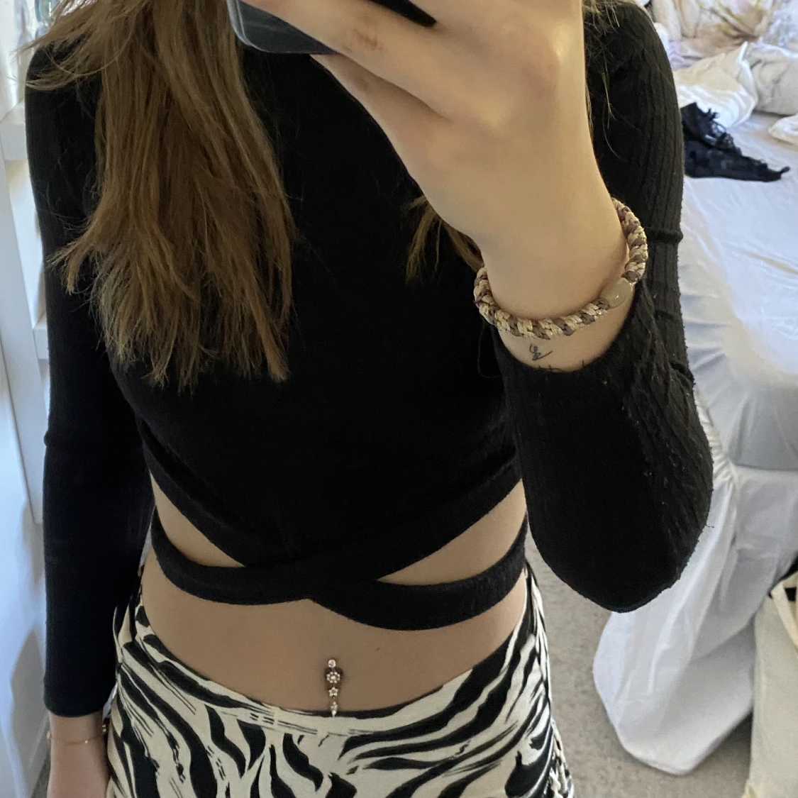 Svart topp med korsade band där nere! Knappt använd så skicket är jättebra! Den är från shein i storlek Xs men sitter bra på mig med S!