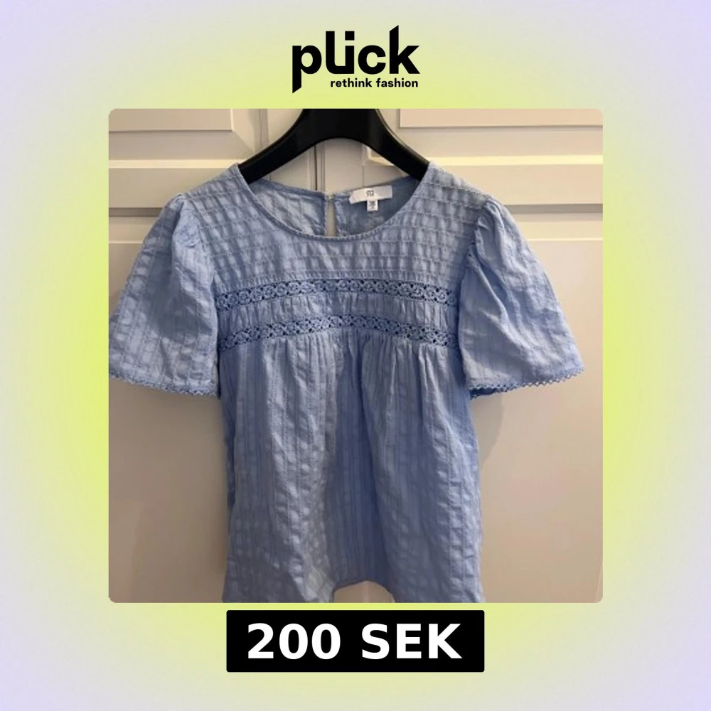 Säljer en söt ljusblå blus med spetsdetaljer. Blusen har korta ärmar och en rund halsringning. Perfekt för vår och sommar!