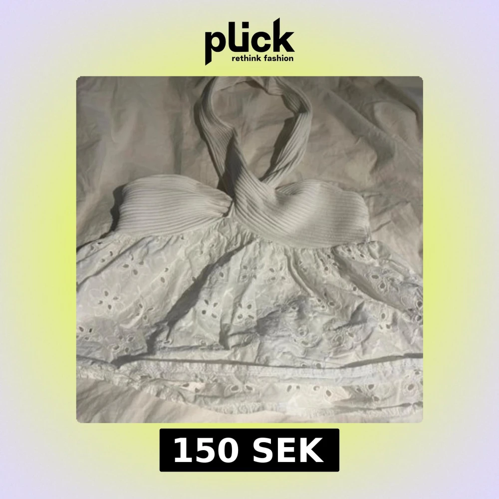 Supersöt vit halterneck topp med ribbad överdel och broderade blommor på den vida nederdelen. Toppen har omlottkrage och är ärmlös, nästintill nyskick har använts 1-2 gånger