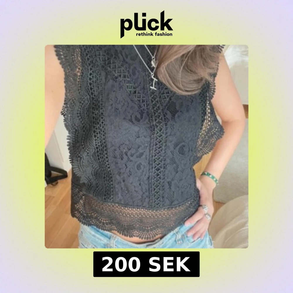 Snygg svart spetsblus med vackra detaljer och ett elegant mönster. Blusen är ärmlös och har en fin kantdetalj längst ner. Perfekt för att ge en stilren look.