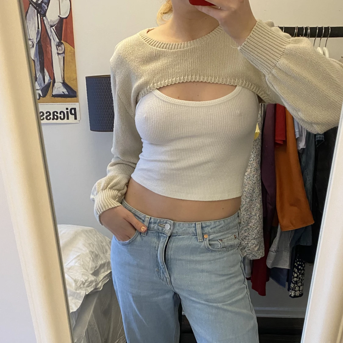 Vitt linne med inbyggd stickad bolero. Super fin vårtröja som passar till det mesta💗