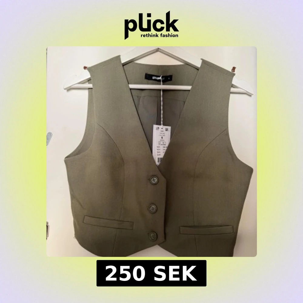 Snygg oanvänd khakifärgad väst från Gina Tricot med knappar framtill. Västen har en klassisk design med två fickor och är tillverkad i ett bekvämt material.❣️