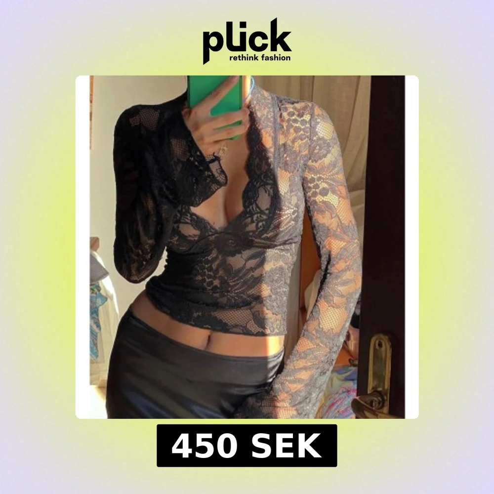 Snygg svart spetsblus med djup v-ringning och långa ärmar. Perfekt för en elegant look med sitt genombrutna mönster och figurnära passform. Använd enstaka gånger.
